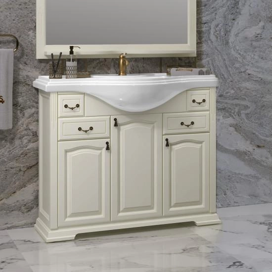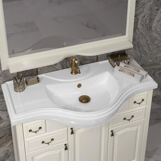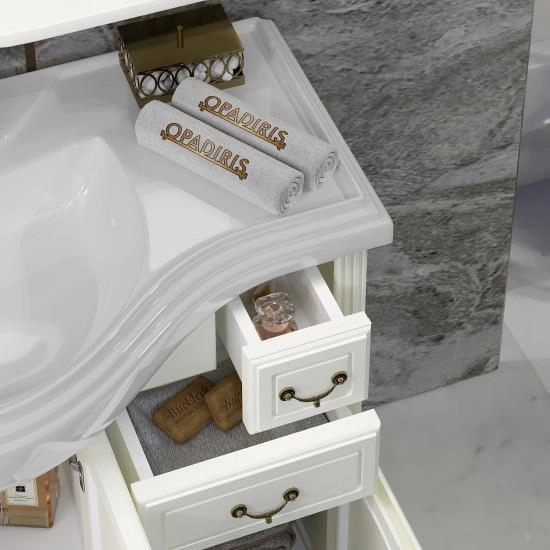 Коллекция Риспекто символизирует лучшие традиции неоклассики в сочетании с необыкновенной функциональностью и простотой дизайна. Успех и уникальность коллекции Риспекто формируется из нескольких вариантов отделок Нагал, Слоновая кость и Белая, а также размерным рядом моделей 95 см, 105 см и 120 см и глубокой керамической раковиной. Завершенность стилю коллекции Риспекто придают сложные филенчатые фасады мебели. Несколько вариантов пеналов (узкий, стандартный (с бельевой корзиной) и двустворчатый) удачно завершают комплектацию коллекции Риспекто. Размеры 1070/905/510 ш/в/г. Вся мебель Opadiris покрыта прочным слоем влагостойкого лака. Материалы изготовления : Массив дерева — Бук. Корпус : Корпус мебели изготавливается из ламинированных панелей ДСП высшего сорта категории качества Е1 а в некоторых изделиях из ценных пород массива дерева (БУК). Обладает повышенной влагостойкостью и сопротивляемостью износам и ударам. Не выделяет вредных испарений в воздух, хорошо выдерживает воздействие бытовых химических средств. Края корпусных деталей так же защищены ПВХ кромкой. Отделка : Защитный слой фасадов и корпусных деталей состоит из нескольких слоев грунта и матовой отделочной эмали производства Herberiz (Германия) и Renner(Италия). Фурнитура : Надежная фурнитура BRASS (Испания Италия), BOYARD и HETTICH (Германия).