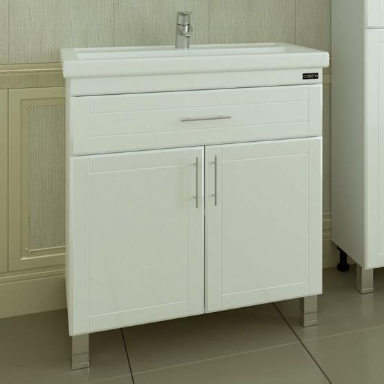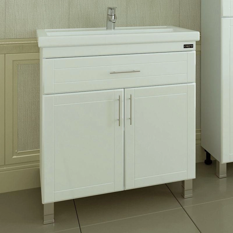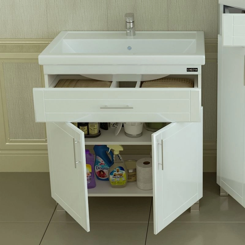 Тумба под раковину СаНта Дублин 80 223005 напольная, цвет белый (1 ящ. ) Корпус и фасад изделия выполнены из влагостойкого из МДФ и покрыты глянцевой ПВХ-пленкой. В этой модели встроены два выдвижных ящика. В верхнем ящике организован доступ к подключению коммуникаций.