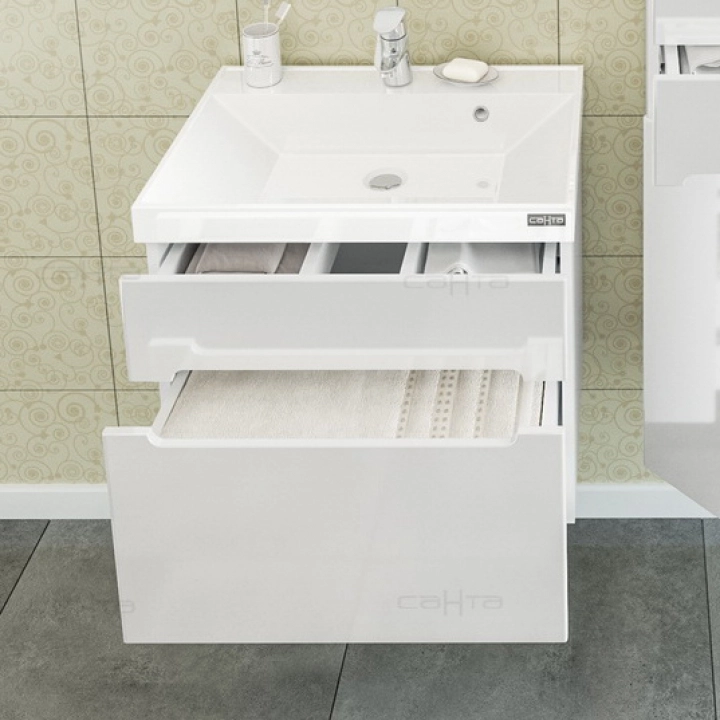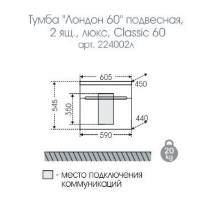Основные характеристики: Выполнена в современном стиле High-Tech. Тумба подвесная "Лондон 60" для умывальника "Classic 60". Корпус и фасад изделия выполнены из влагостойкого из МДФ и покрыты глянцевой ПВХ-пленкой. В этой модели встроены два выдвижных ящика с плавным ходом и бесшумным закрыванием. В верхнем ящике организован доступ к подключению коммуникаций. Комплектация: выдвижной ящик с плавным ходом и бесшумным закрыванием - 2 шт. Раковина приобретается дополнительно.