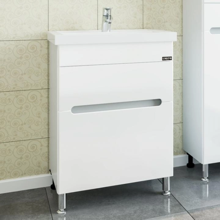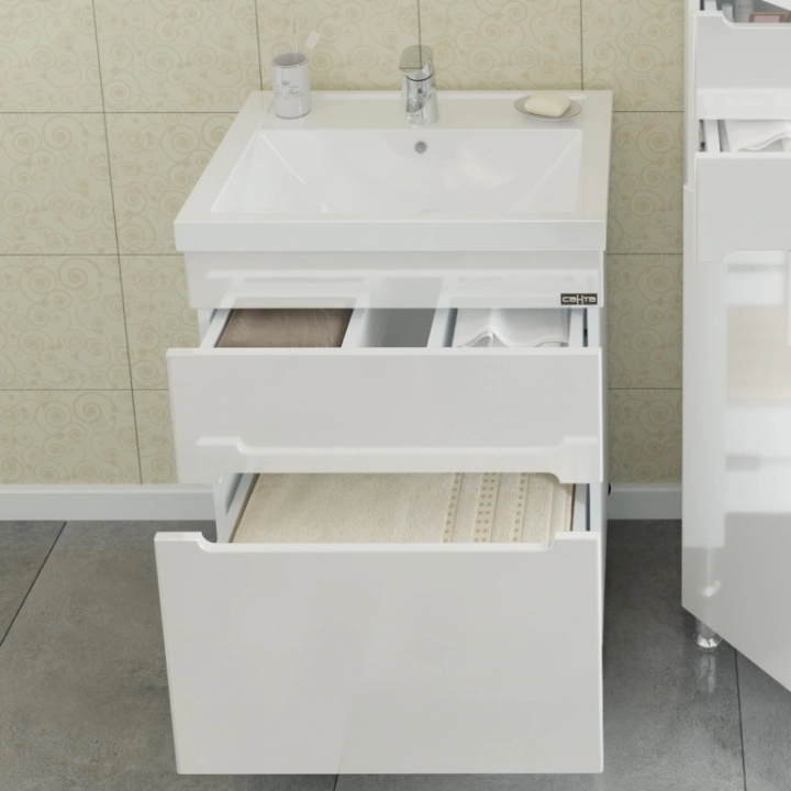 Тумба под раковину СаНта Лондон 60 224005л, напольная (2 ящ. ) Тумба напольная "Лондон 60" для умывальника "Фостер 60". Корпус и фасад изделия выполнены из влагостойкого из МДФ и покрыты глянцевой ПВХ-пленкой. В этой модели встроены два выдвижных ящика с плавным ходом и бесшумным закрыванием. В верхнем ящике организован доступ к подключению коммуникаций.
