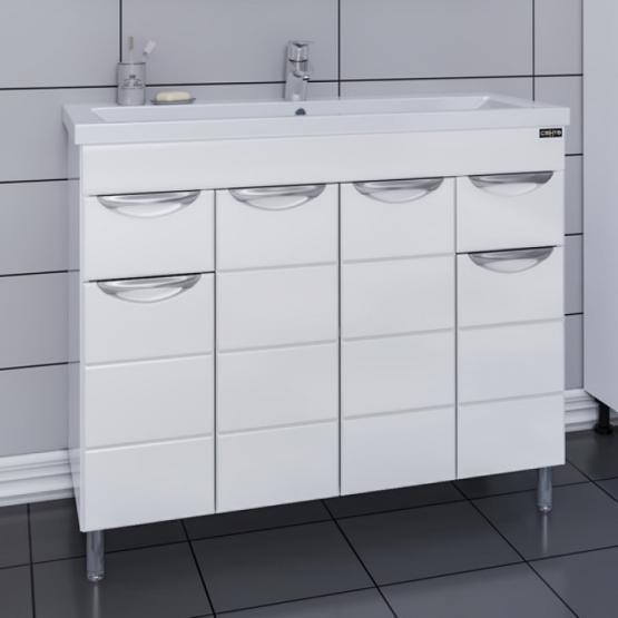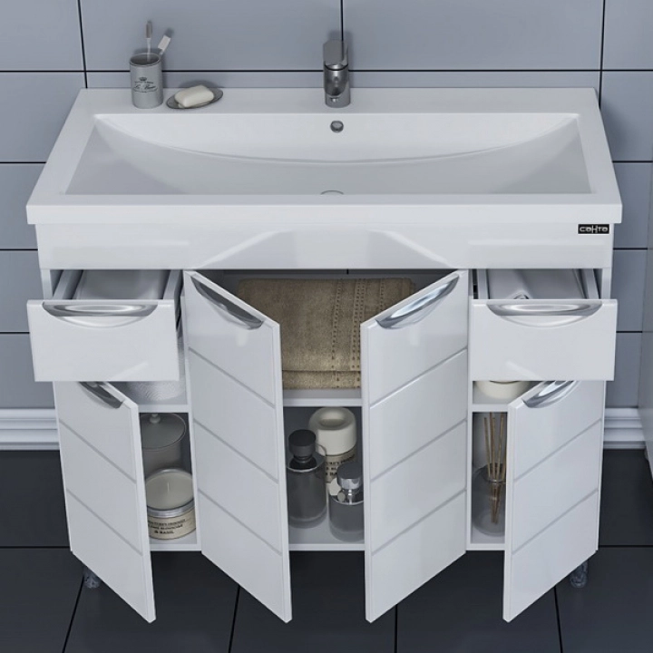Тумба под раковину СаНта Родос 100 206016 напольная, цвет белый Комплектация: ручка хром - 5 шт. , выдвижной ящик с шариковыми направляющими полного выдвижения - 2 шт., петли с плавным закрыванием - 3 шт.