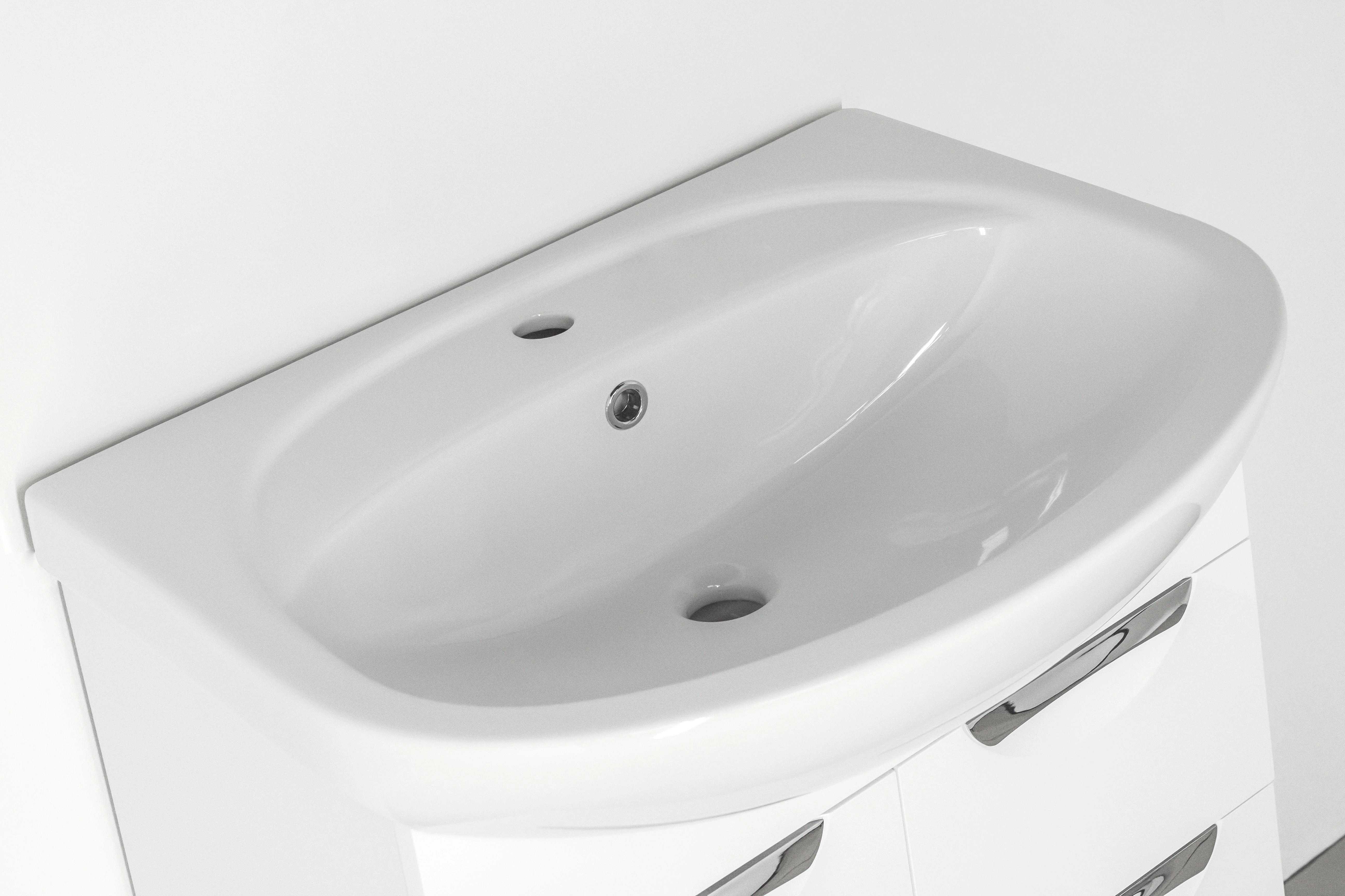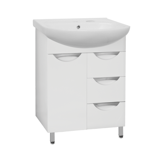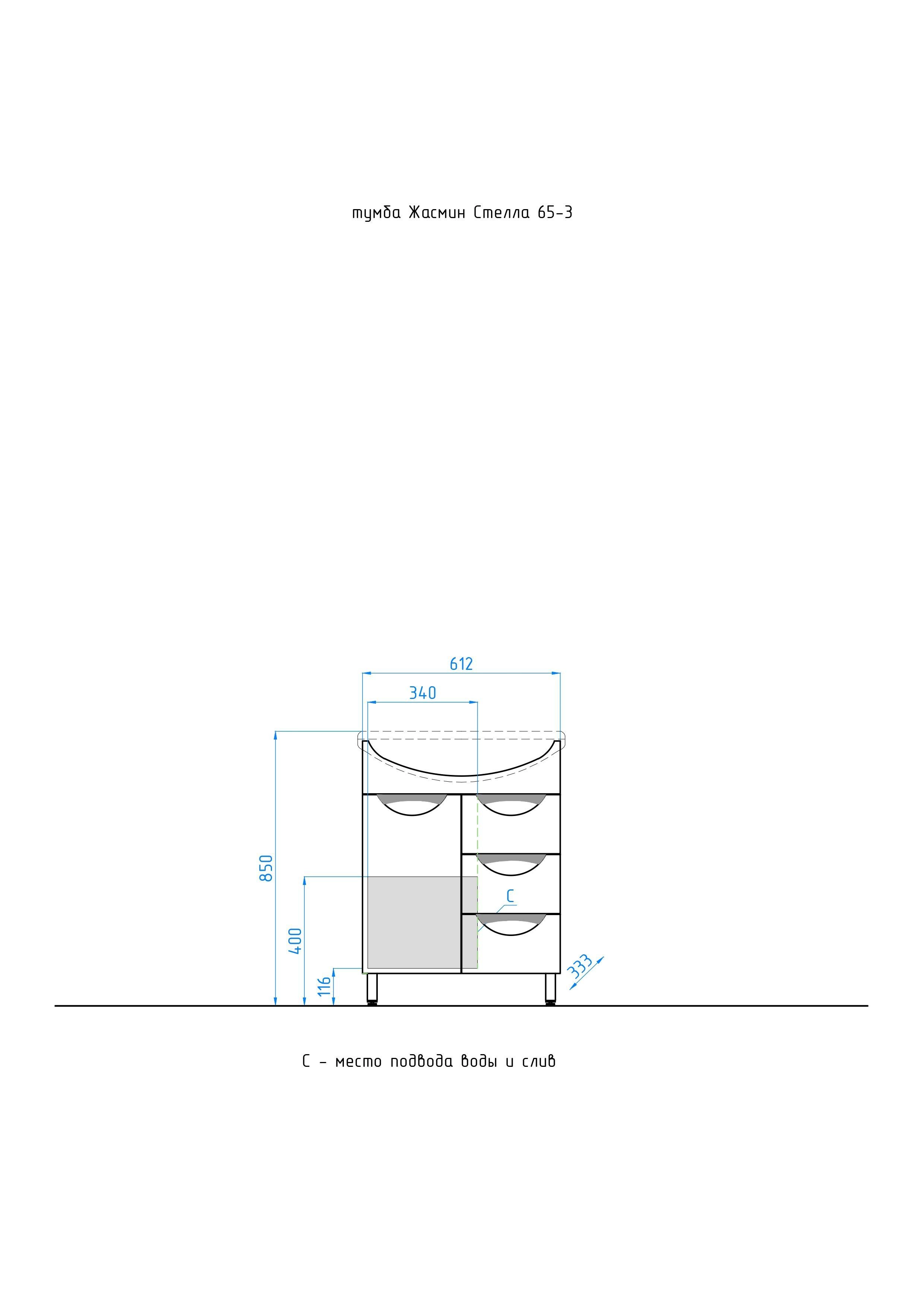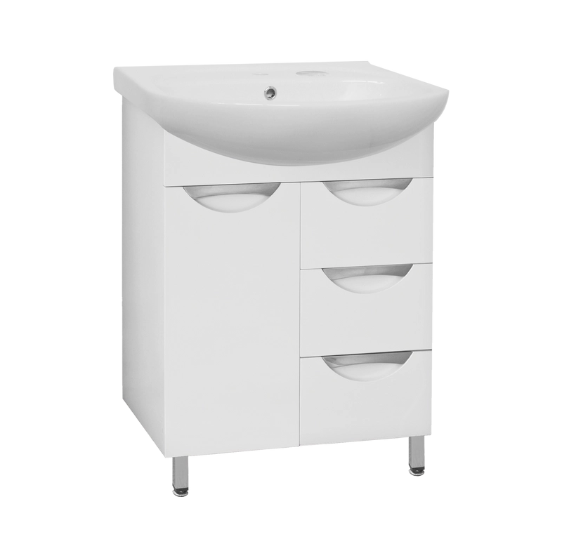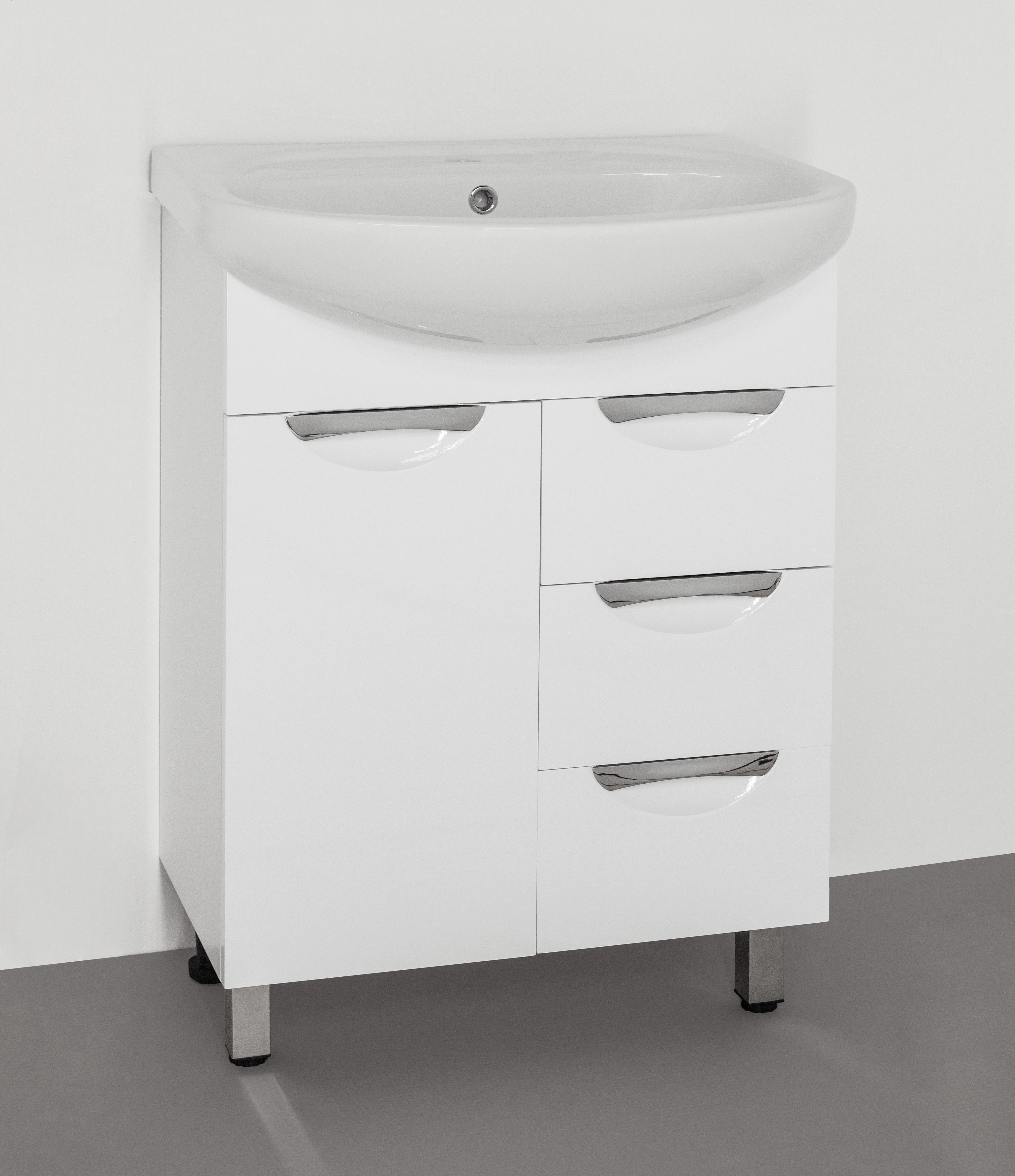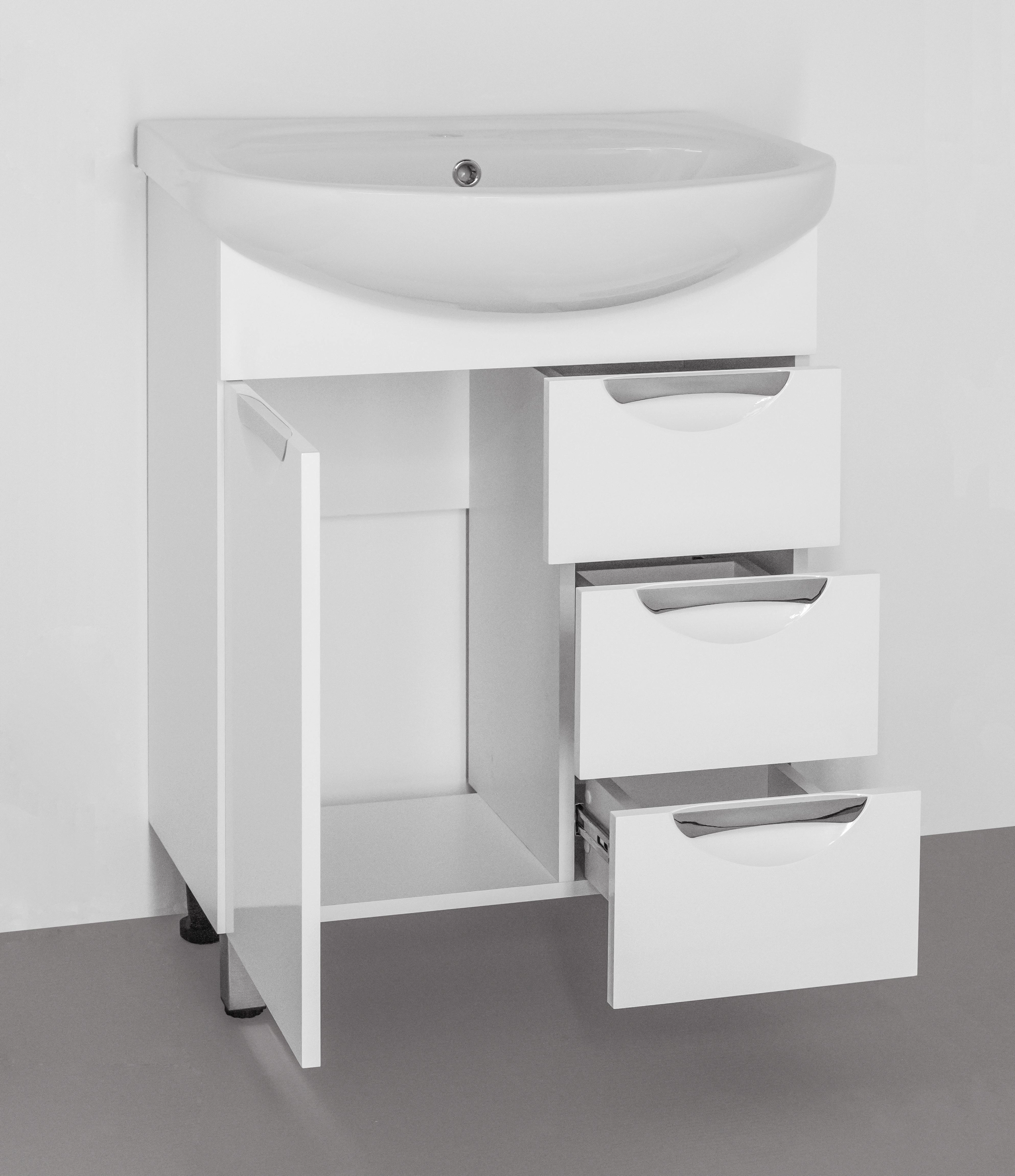 Тумба напольная бренда "Style Line" коллекции "Жасмин" со стильными врезными ручками. Фурнитура - хром, направляющие полного выдвижения Hettich; сборка изделия с помощью эксцентриковых стяжек Hafele; все материалы полностью влагостойкие. Данная тумба предусматривает открытую подводку воды