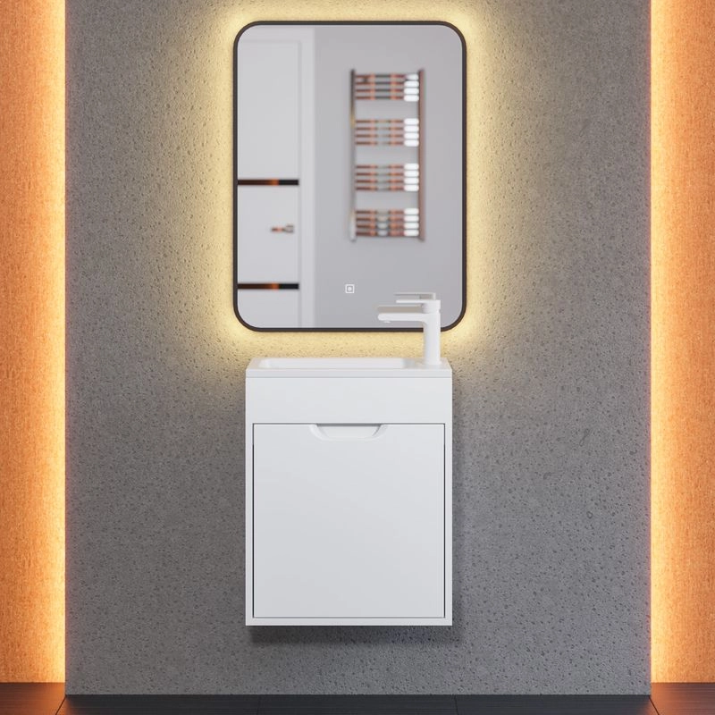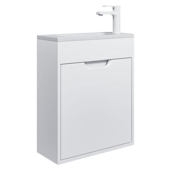 Готовый комплект для ванной комнаты от бренда Uperwood из коллекции Modul состоит из подвесной тумбы под раковину с распашной дверцей и раковины из литьевого мрамора с декоративной накладкой для слива шириной 50 см.
