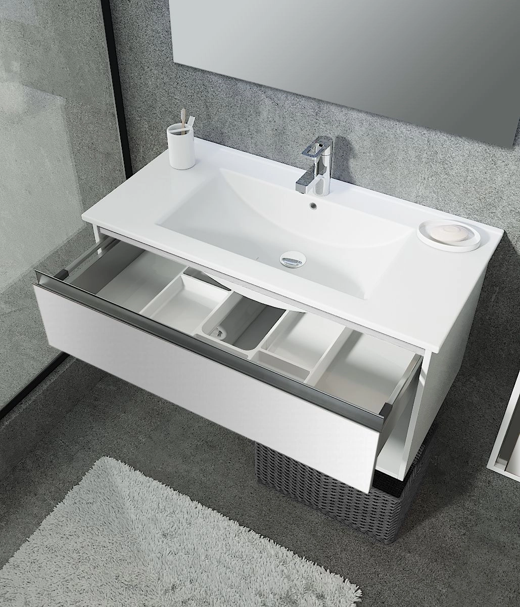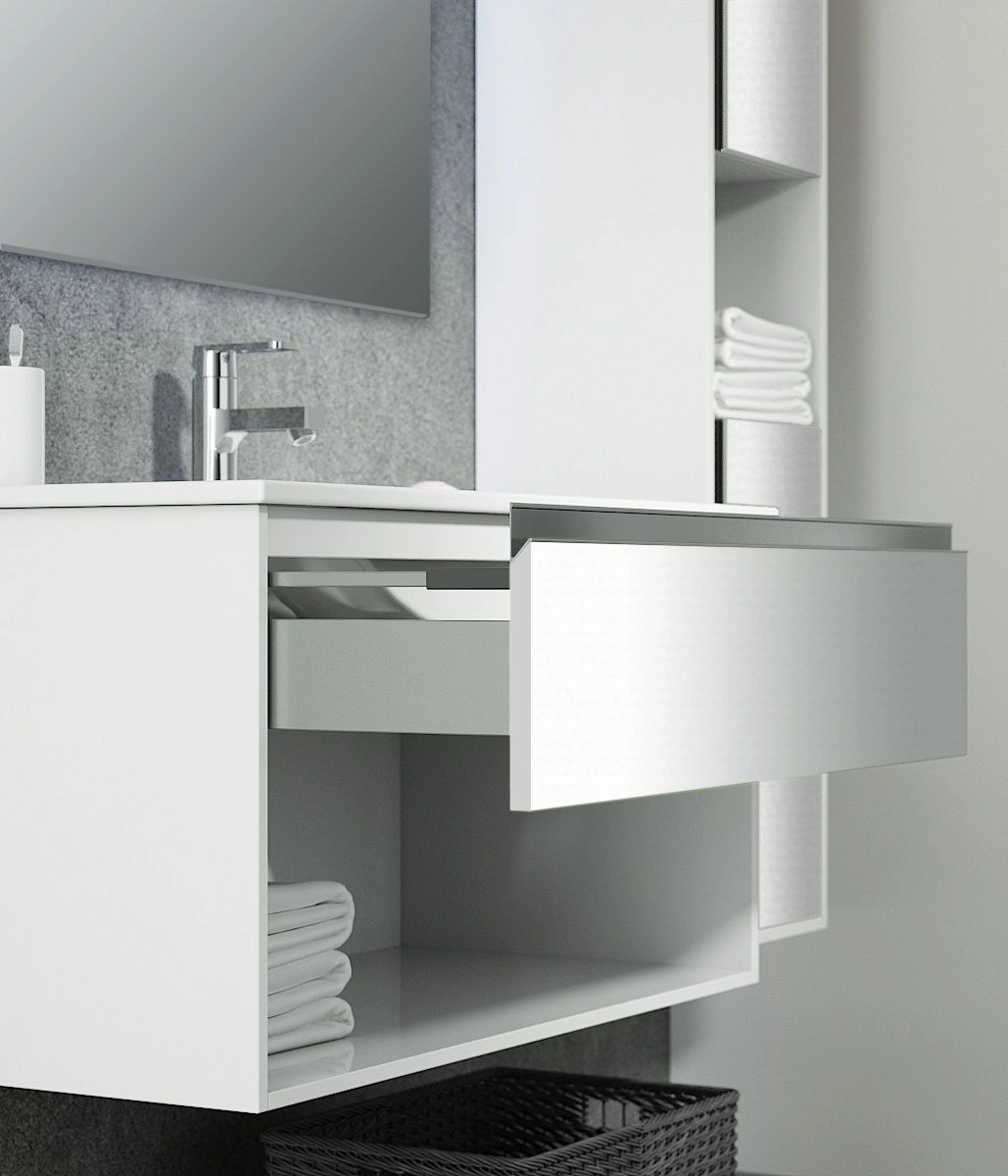 Мебель Контур — универсальный дизайн, сочетающий в себе комфорт и функциональность.Все выдвижные и распашные элементы оснащены системами плавного закрывания.Один выдвижной ящик с механизмом плавного закрывания, широкая открытая ниша, интегрированная ручка, хром угол 45.
