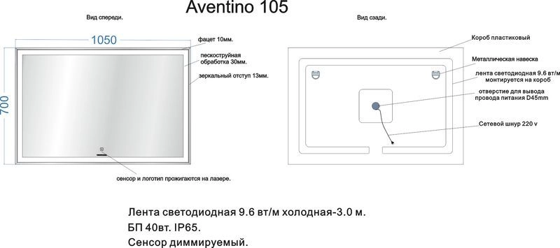 Материал корпуса акрил. Материал фасада зеркало. В комплекте: крепления. Мощность подсветки 12Вт