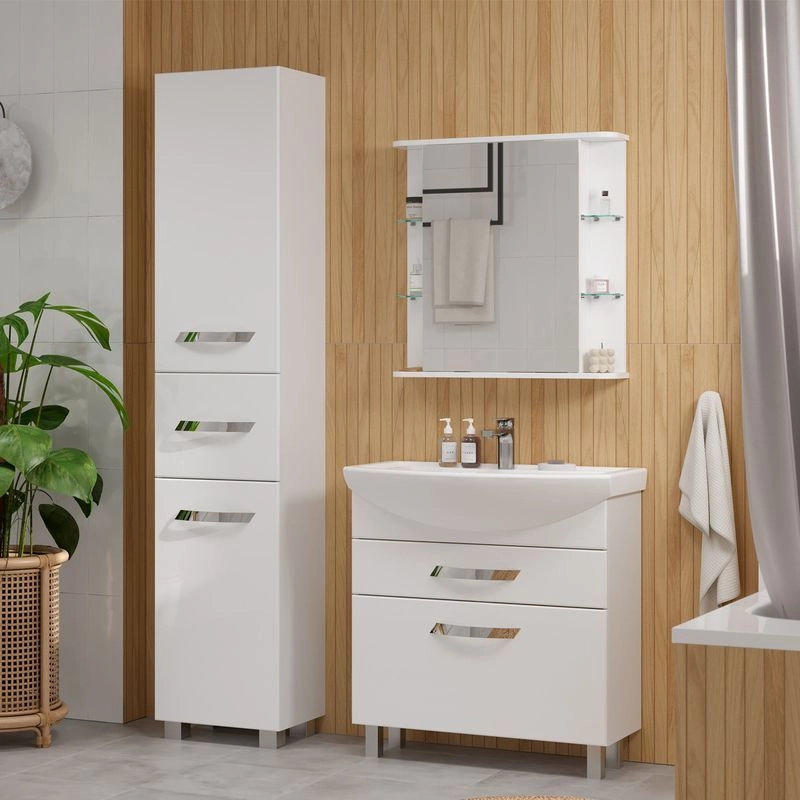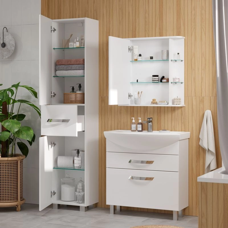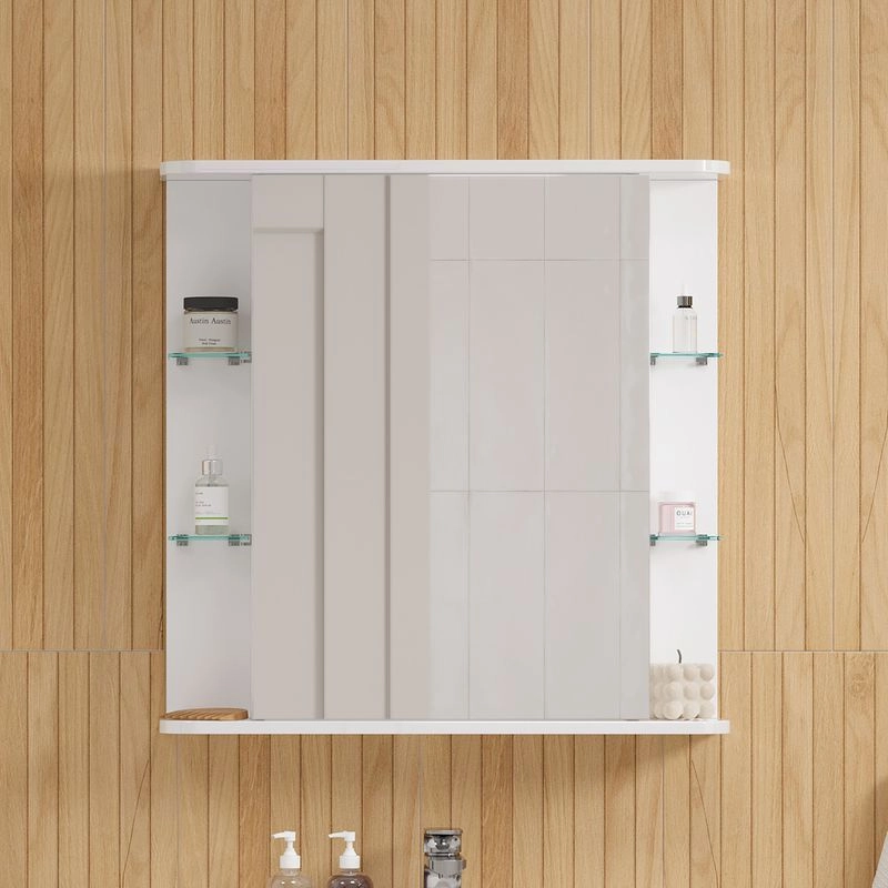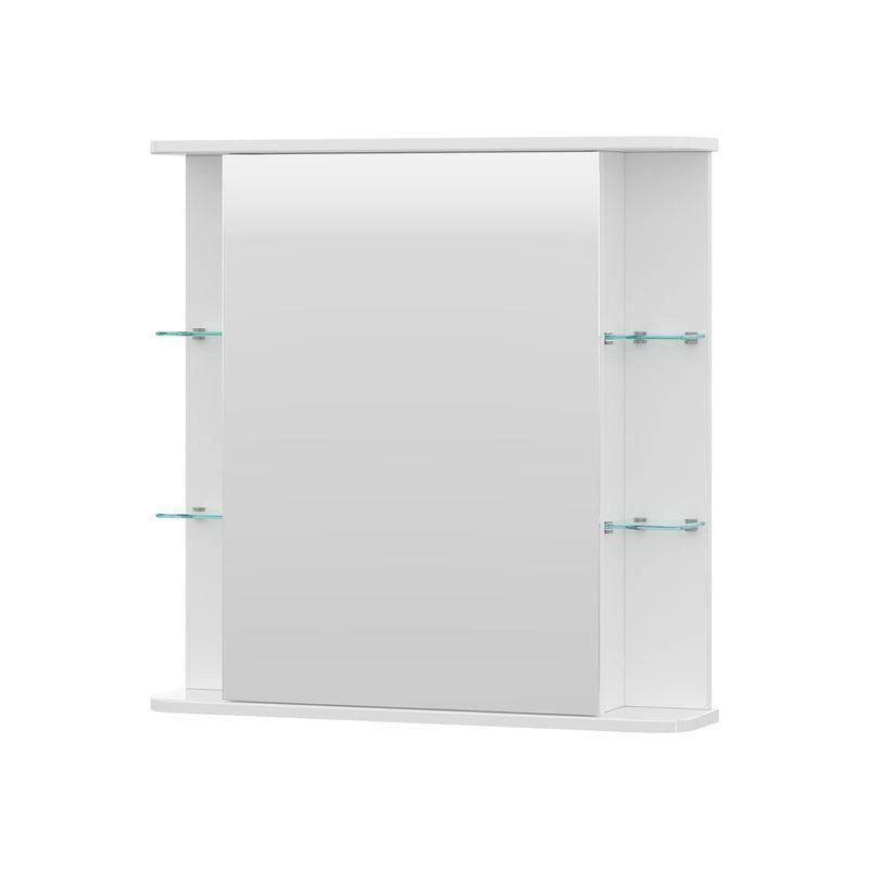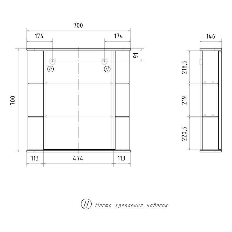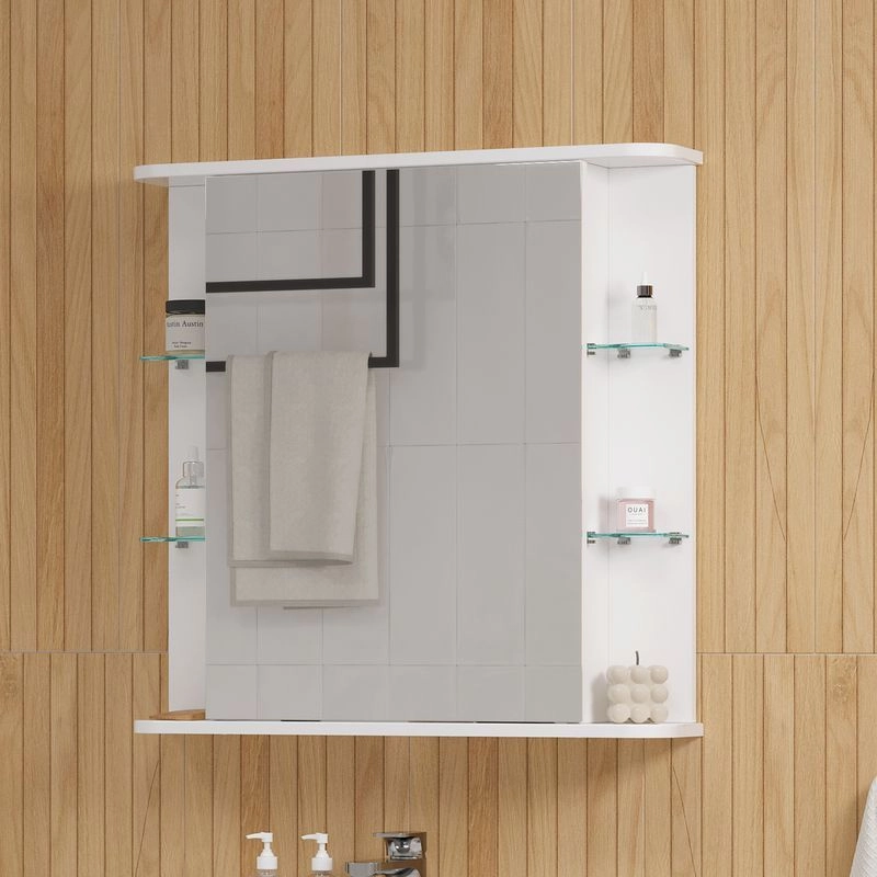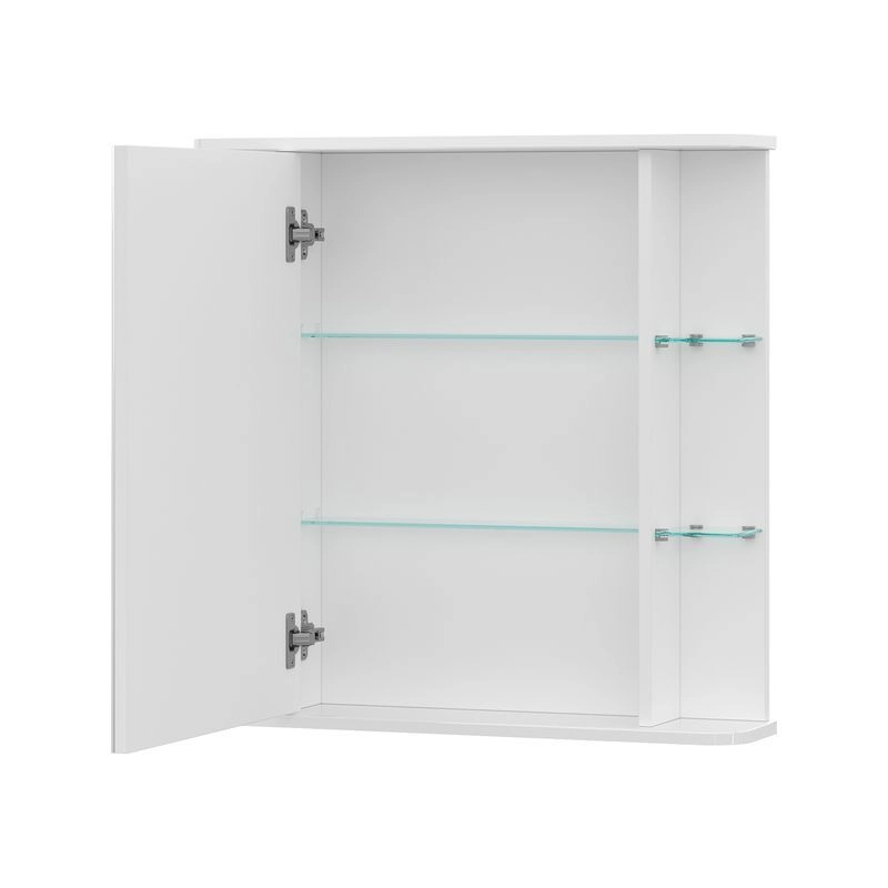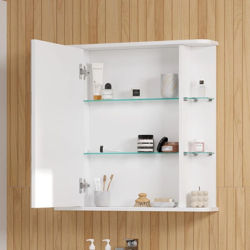 Шкаф зеркальный с 2 двумя внутренними стеклянными полками и 4-мя внешними. По умолчанию шкаф зеркальный собран с открыванием дверки налево. При необходимости дверку можно перевесить на открывание направо. Петли на дверце с доводчиками.