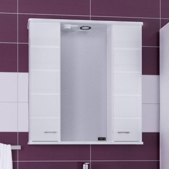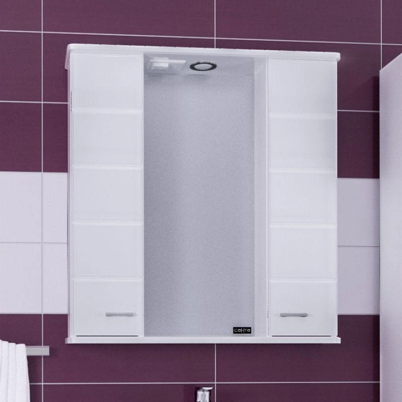 Зеркальный шкаф СаНта Омега 75 107005, с подсветкой Комплектация: Ручка хром - 2, зеркало со шкафчиками и нижней полочкой укомплектовано светильником, включателем, розеткой. На дверках петли плавного закрывания.