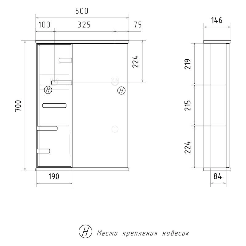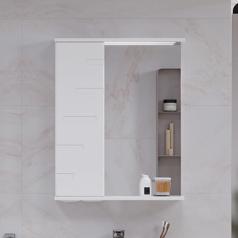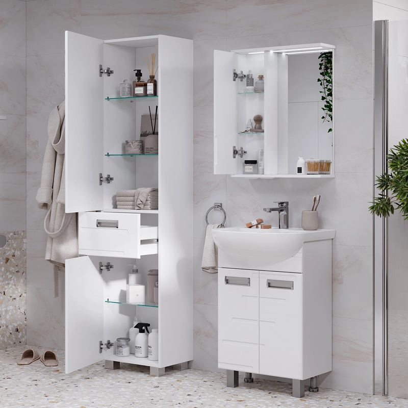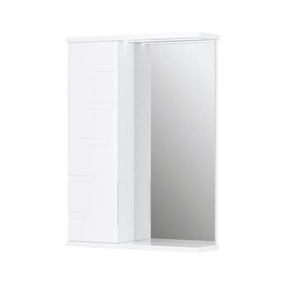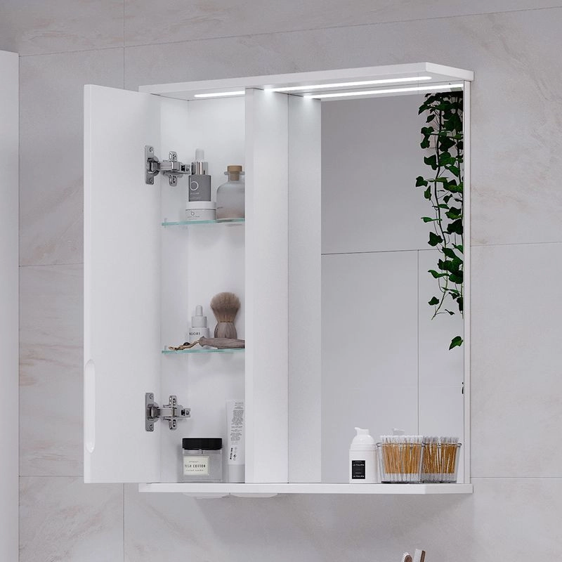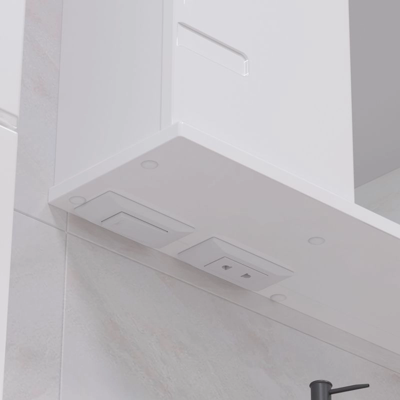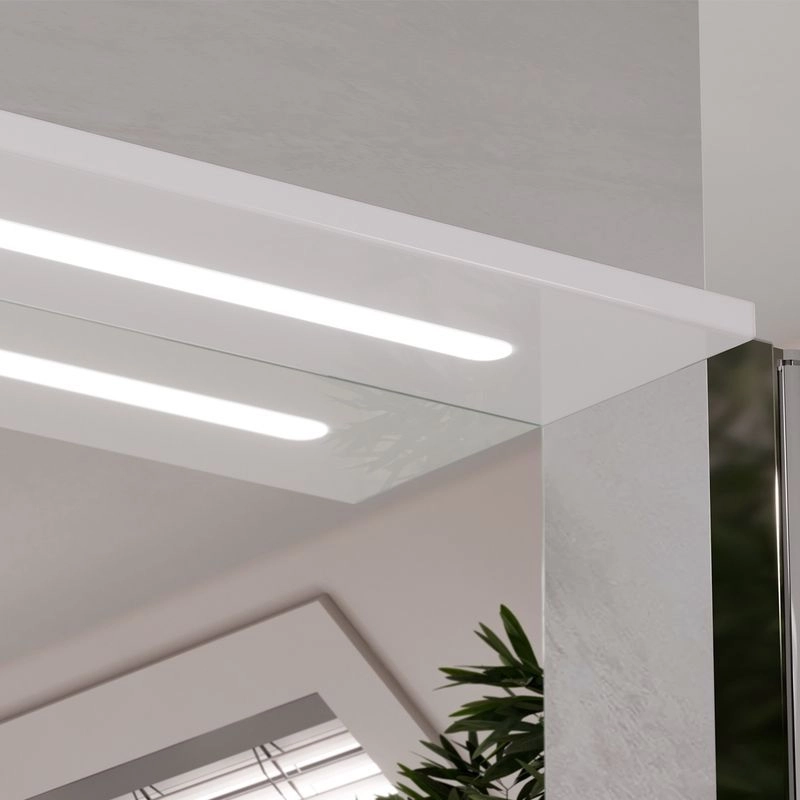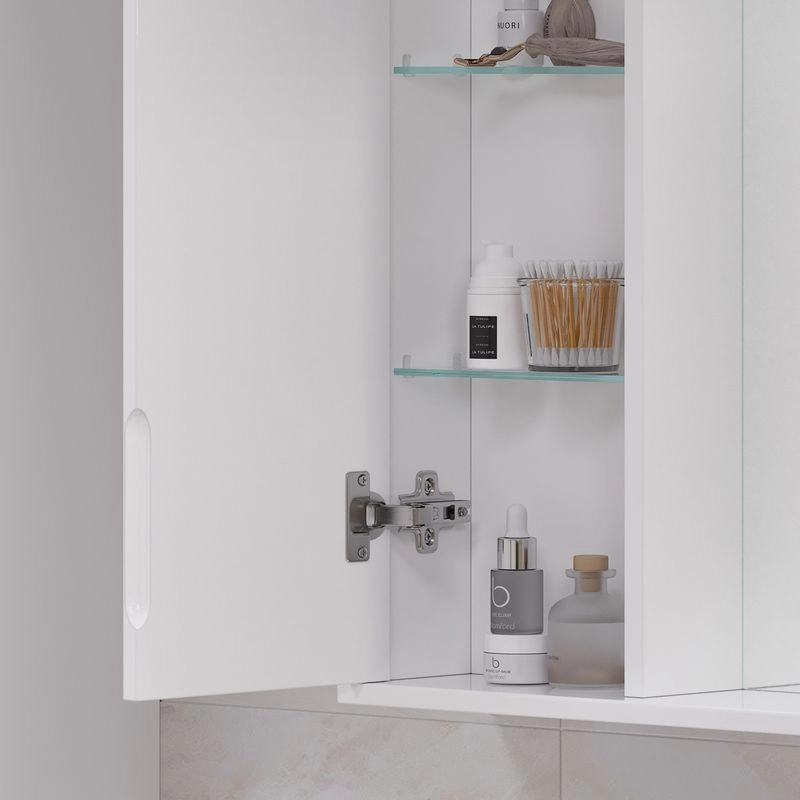 Зеркало-шкаф с двумя стеклянными полками за распашной дверцей. Петли оснащены доводчиками. Фасад зеркального шкафа изготовлена из МДФ и облицована глянцевой пленкой ПВХ. Зеркало-шкаф оснащено встроенной светодиодной подсветкой, электрической розеткой и выключателем. Шкафчик открывается при помощи интегрированной ручки. Декоративна фрезеровка на фасаде, интегрированная ручка, фурнитура с доводчиками, встроенная светодиодная подсветка, розетка, выключатель.