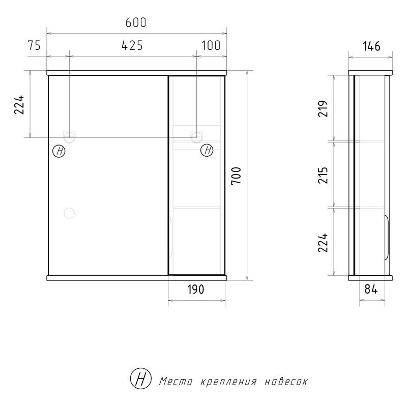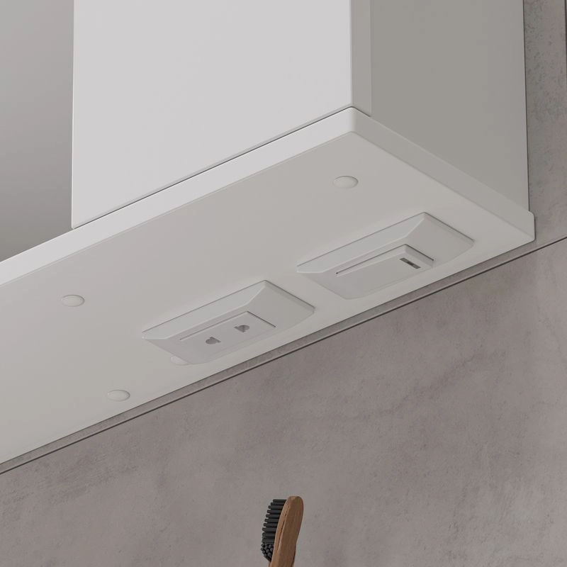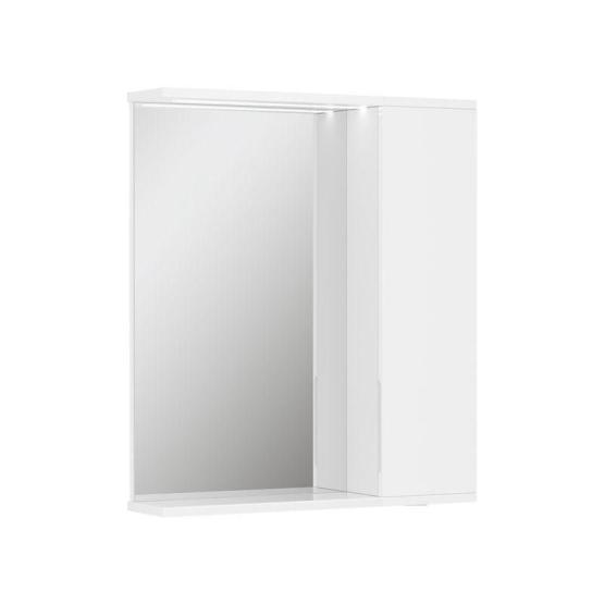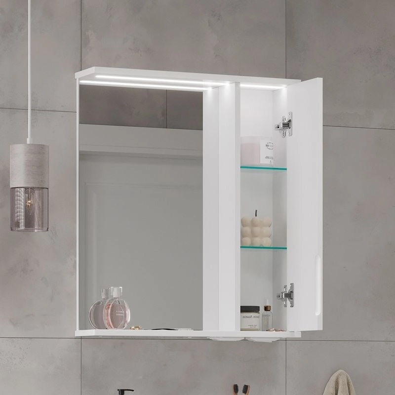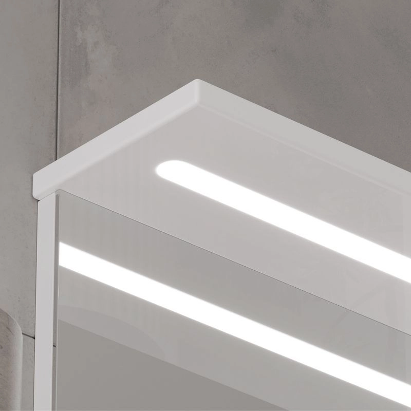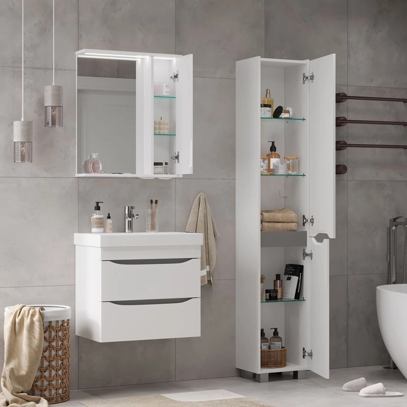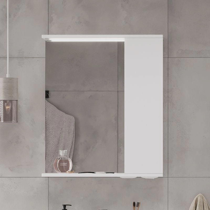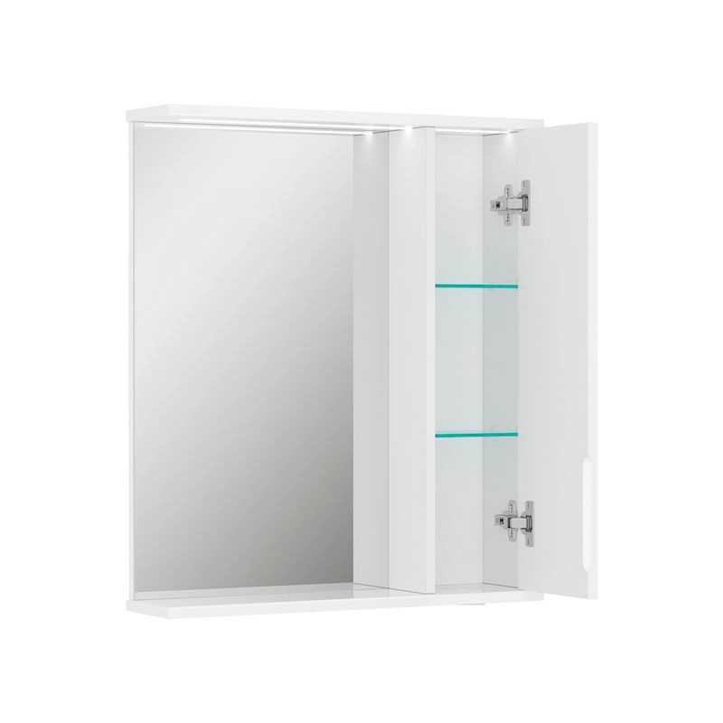 Зеркало-шкаф с двумя стеклянными полками за распашной дверцей. Петли оснащены доводчиками. Фасад зеркального шкафа изготовлена из МДФ и облицована глянцевой пленкой ПВХ. Зеркало-шкаф оснащено встроенной светодиодной подсветкой, электрической розеткой и выключателем. Шкафчик открывается при помощи интегрированной ручки. Интегрированная ручка, фурнитура с доводчиками, встроенная светодиодная подсветка, розетка, выключатель.