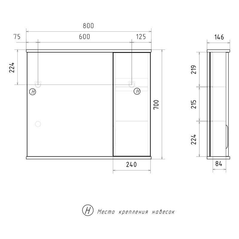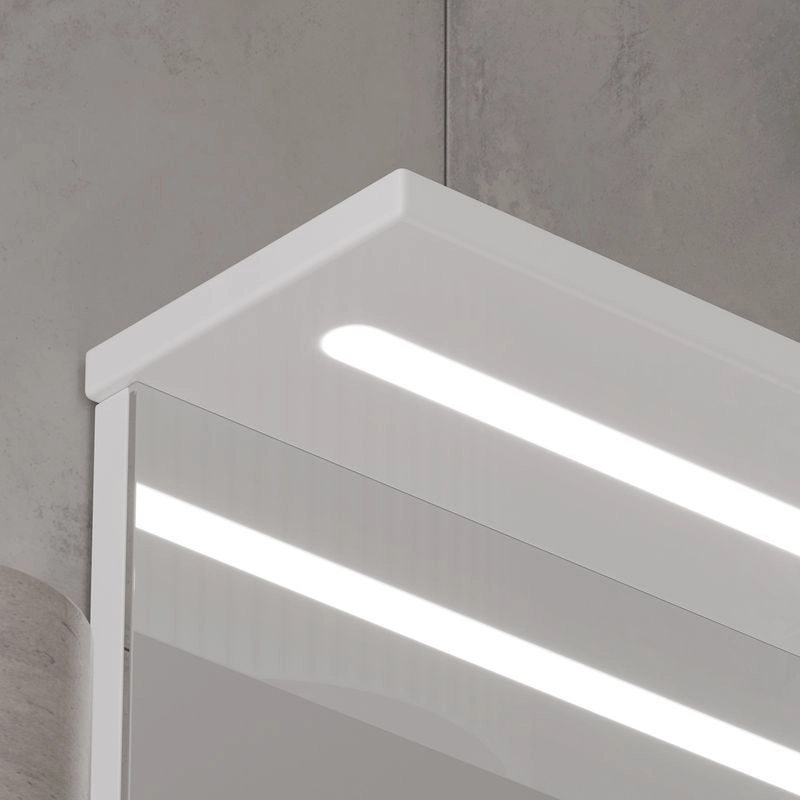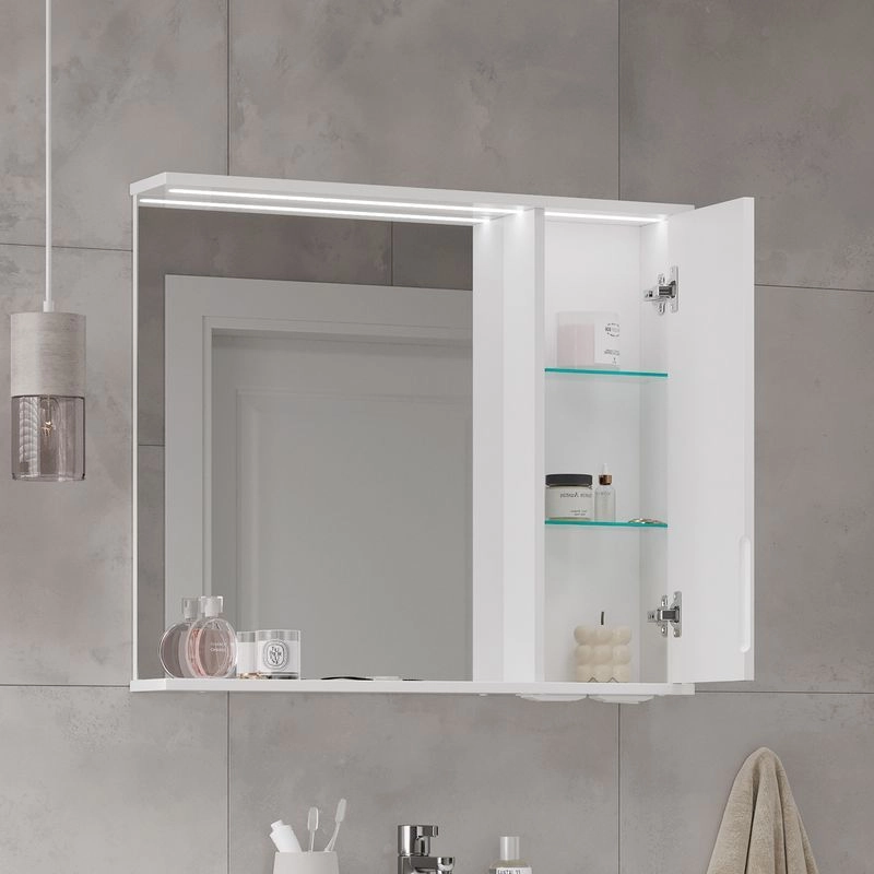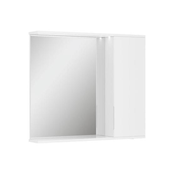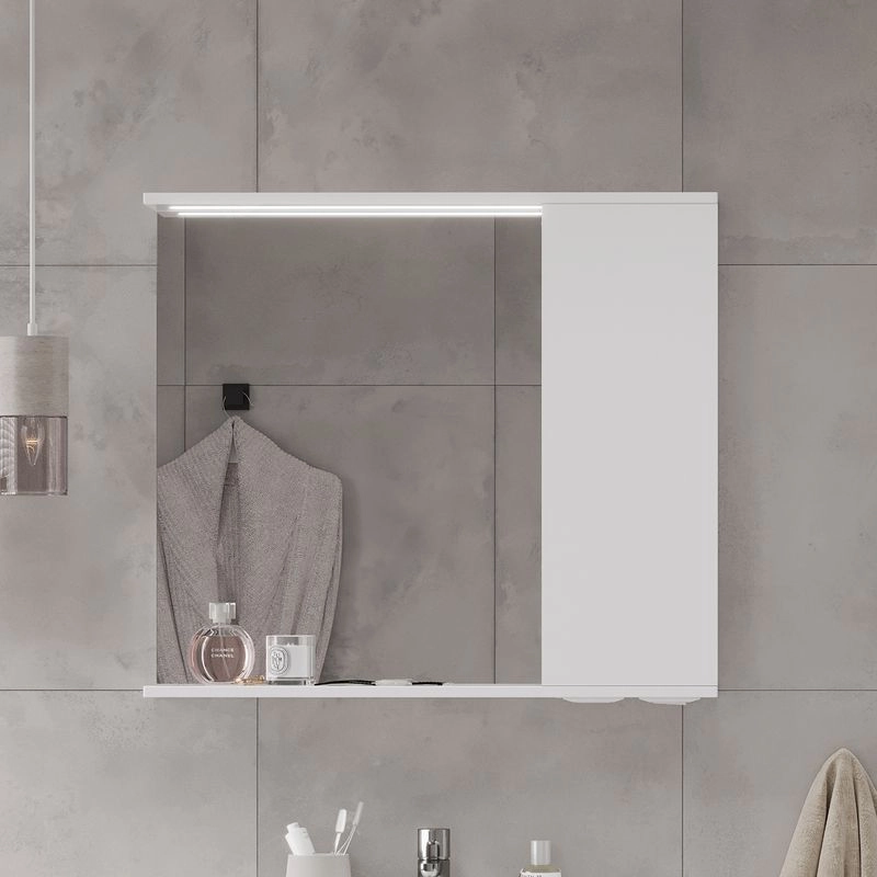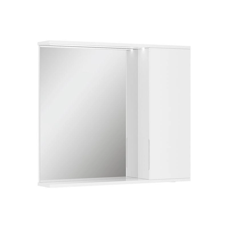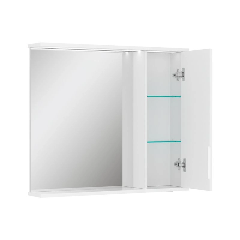 Зеркало-шкаф с двумя стеклянными полками за распашной дверцей. Петли оснащены доводчиками. Фасад зеркального шкафа изготовлена из МДФ и облицована глянцевой пленкой ПВХ. Зеркало-шкаф оснащено встроенной светодиодной подсветкой, электрической розеткой и выключателем. Шкафчик открывается при помощи интегрированной ручки. Интегрированная ручка, фурнитура с доводчиками, встроенная светодиодная подсветка, розетка, выключатель.