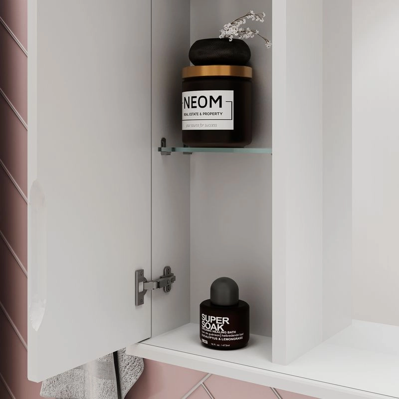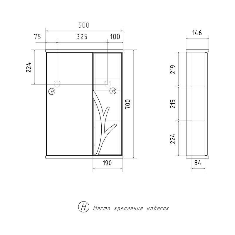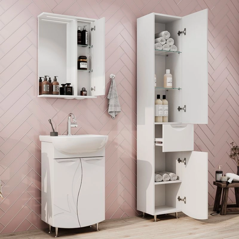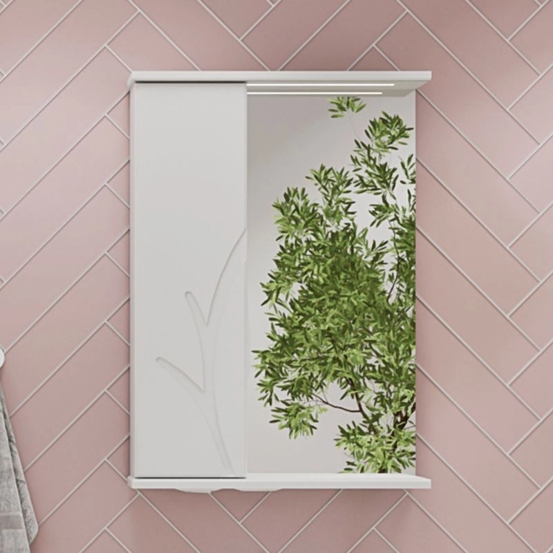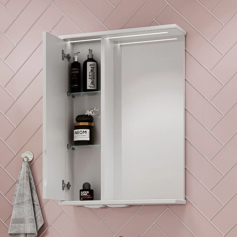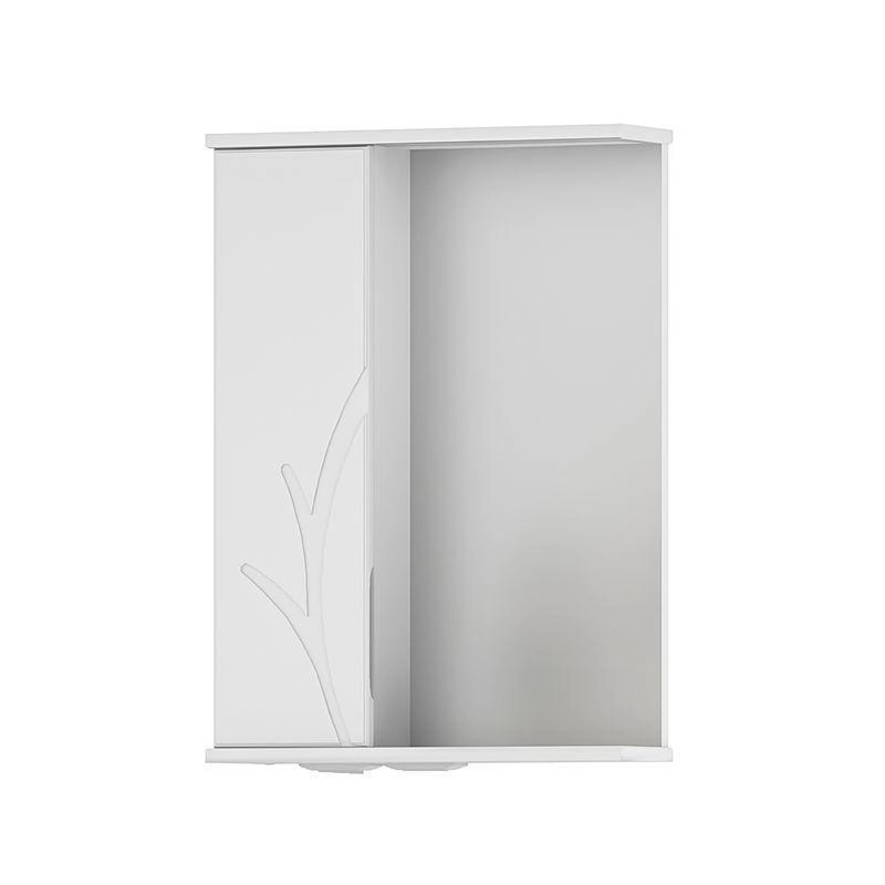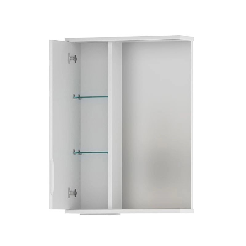 Зеркало-шкаф с двумя стеклянными полками за распашной дверцей. Петли оснащены доводчиками. Фасад зеркального шкафа изготовлена из МДФ и облицована глянцевой пленкой ПВХ. Шкафчик открывается при помощи интегрированной ручки. Декоративна фрезеровка на фасаде, интегрированная ручка, фурнитура с доводчиками.