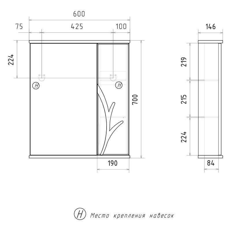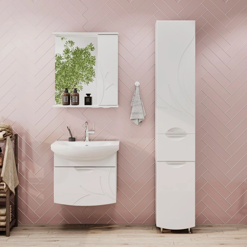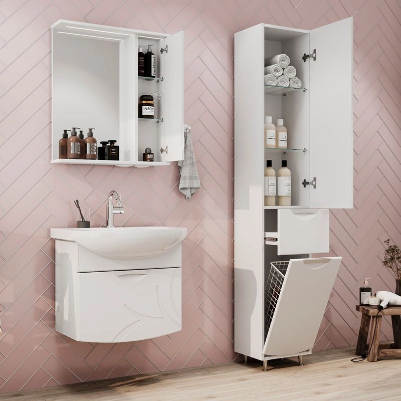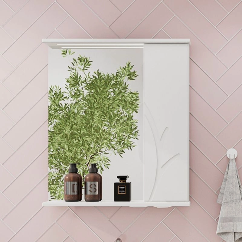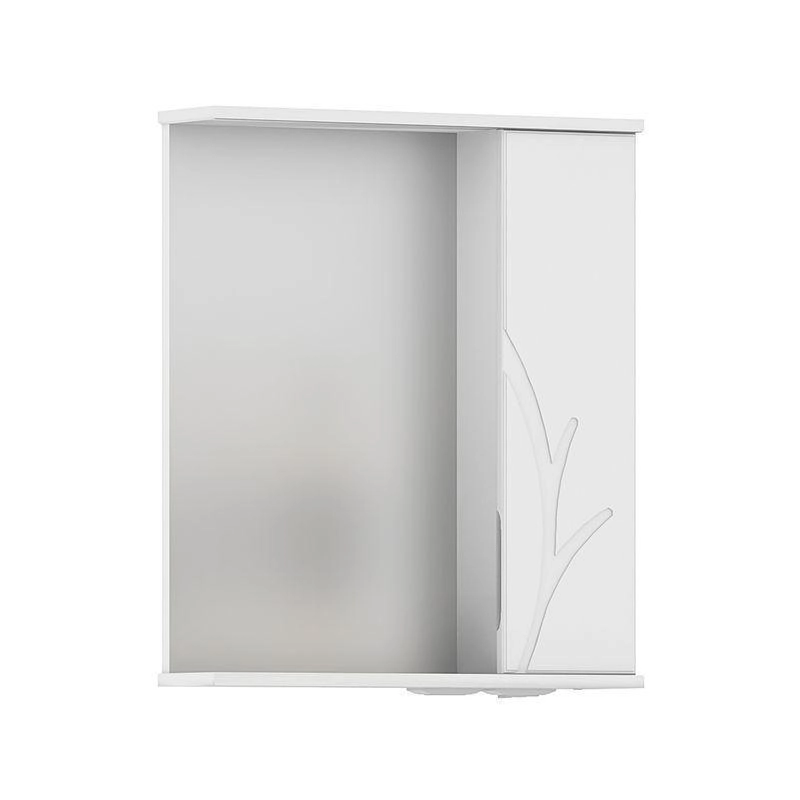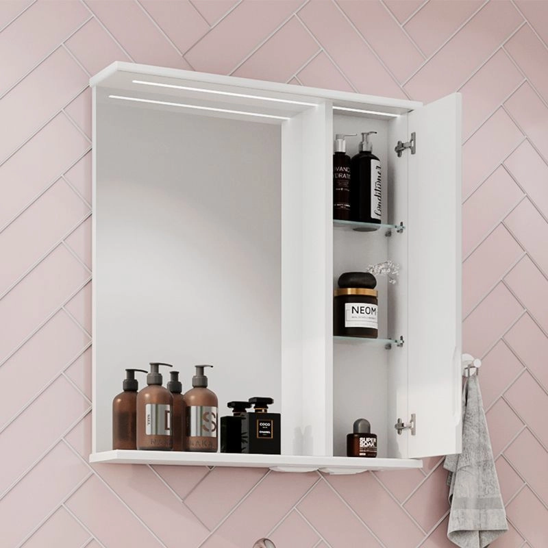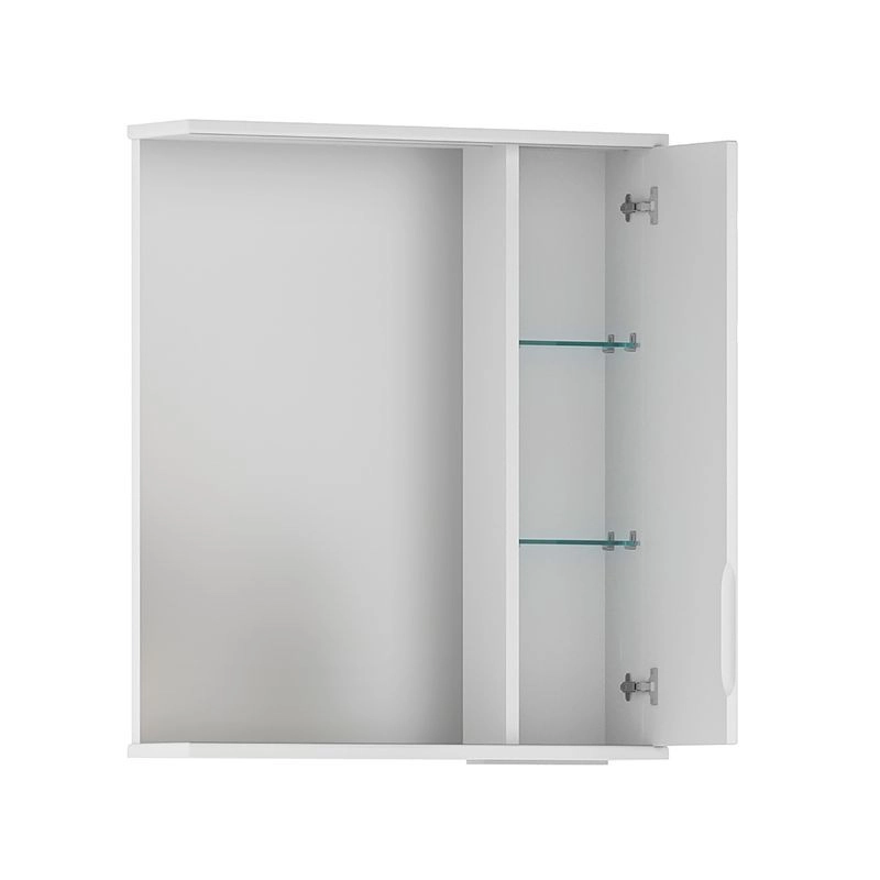 Зеркало-шкаф с двумя стеклянными полками за распашной дверцей. Петли оснащены доводчиками. Фасад зеркального шкафа изготовлена из МДФ и облицована глянцевой пленкой ПВХ. Шкафчик открывается при помощи интегрированной ручки. Декоративна фрезеровка на фасаде, интегрированная ручка, фурнитура с доводчиками.