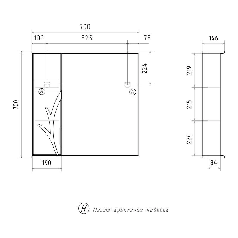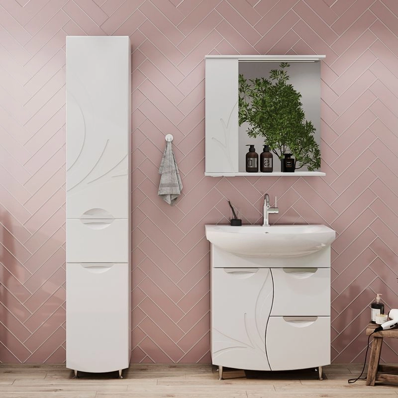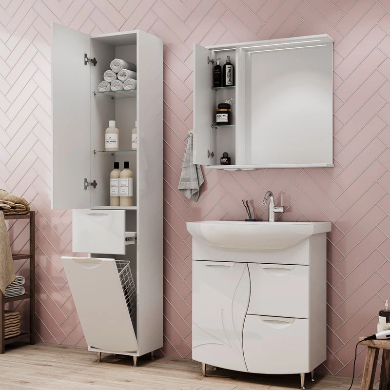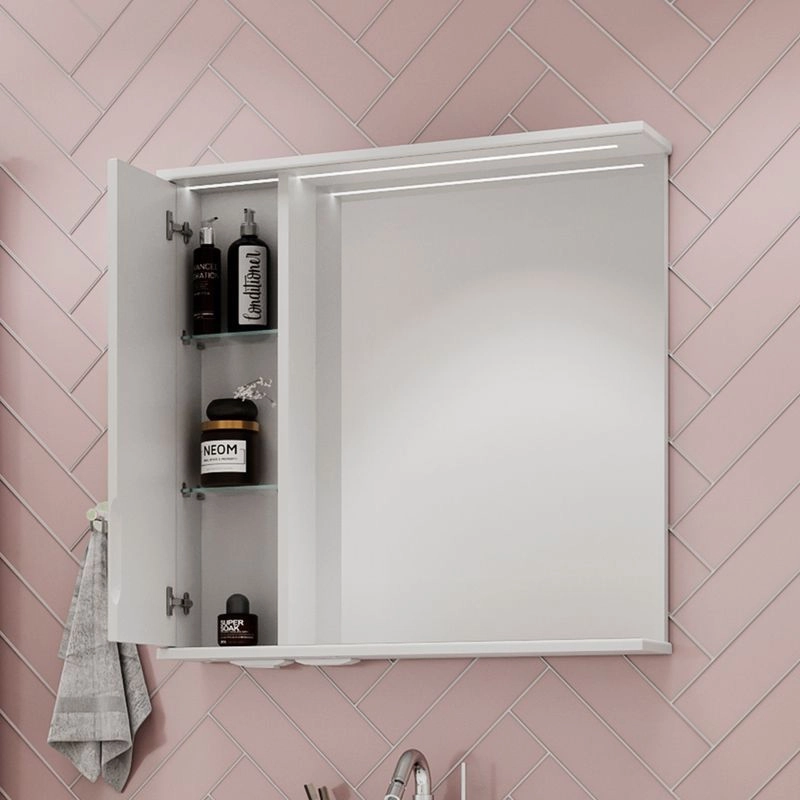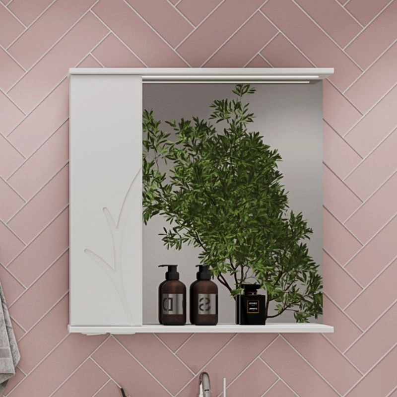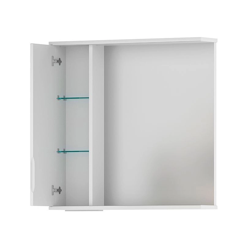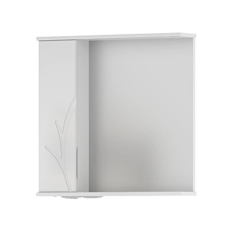 Зеркало-шкаф с двумя стеклянными полками за распашной дверцей. Петли оснащены доводчиками. Фасад зеркального шкафа изготовлена из МДФ и облицована глянцевой пленкой ПВХ. Шкафчик открывается при помощи интегрированной ручки. Декоративна фрезеровка на фасаде, интегрированная ручка, фурнитура с доводчиками.
