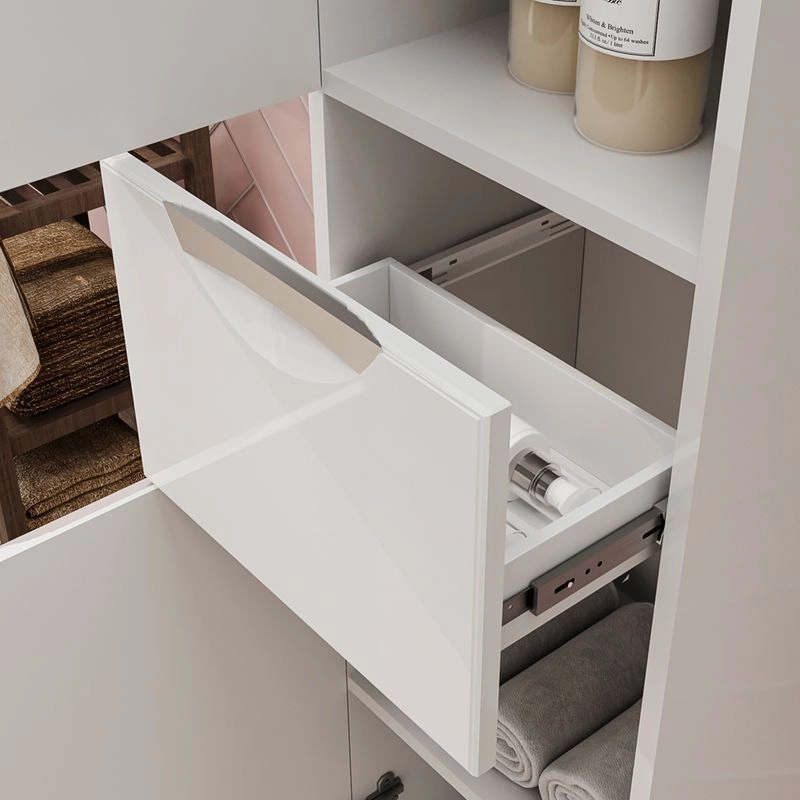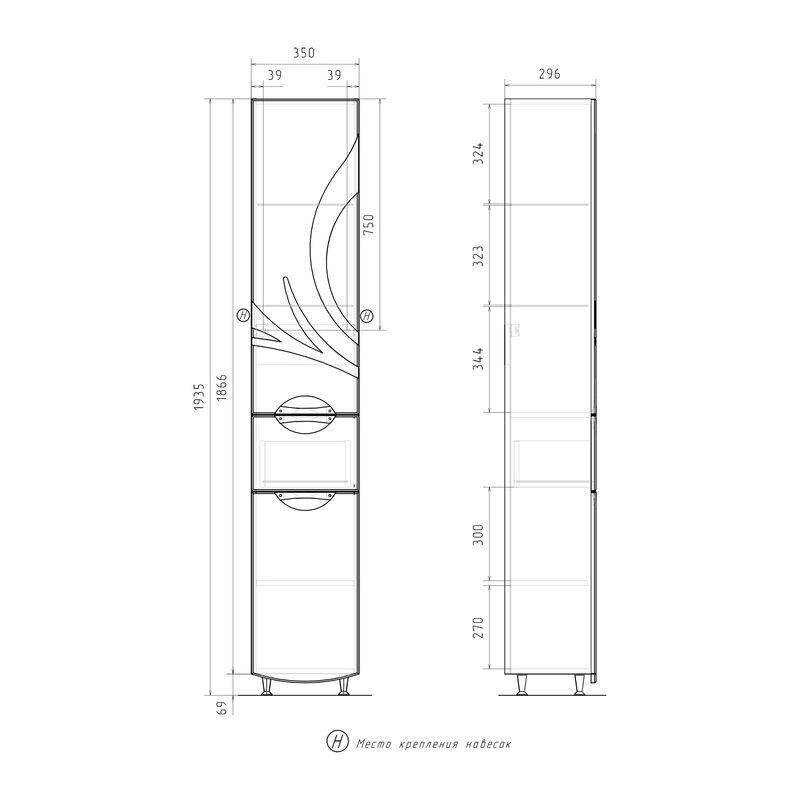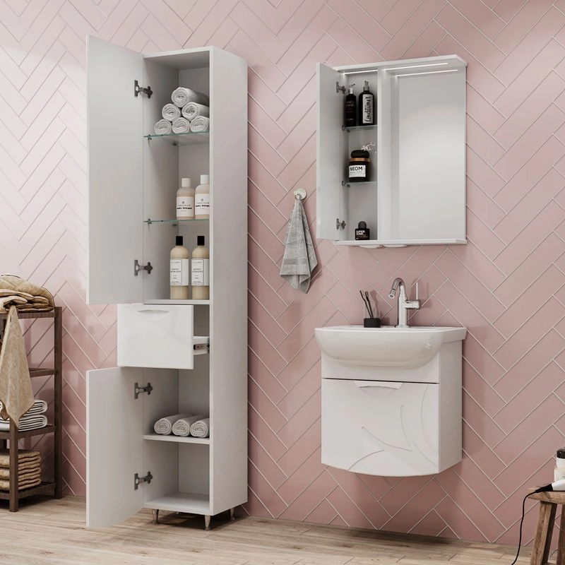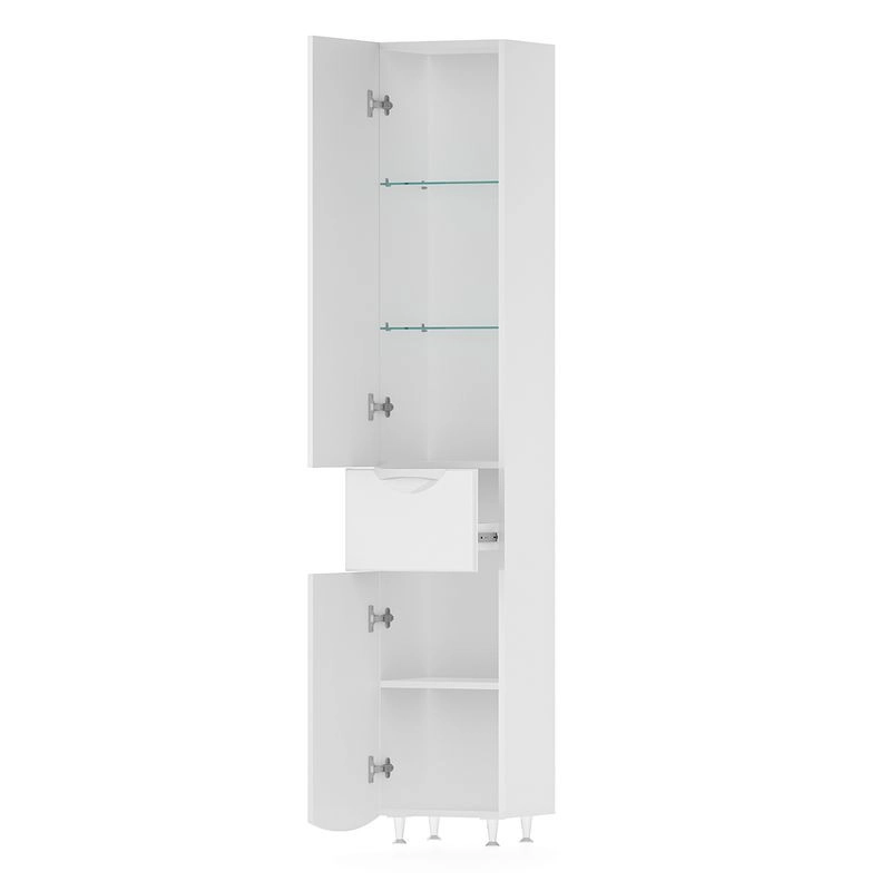 Напольный пенал с двумя стеклянными полками в верхней секции, выдвижным ящиком и одной полкой из ЛДСП в нижней секции. Петли оснащены доводчиками. Дверцы пенала изготовлены из МДФ и облицованы глянцевой пленкой ПВХ. Лицевая фурнитура хром. Пенал устанавливается на четыре регулируемые опоры и фиксируется к стене при помощи креплений. Декоративна фрезеровка на фасаде, фурнитура с доводчиками.