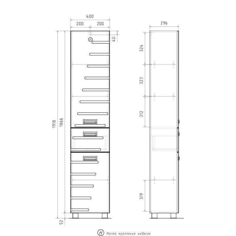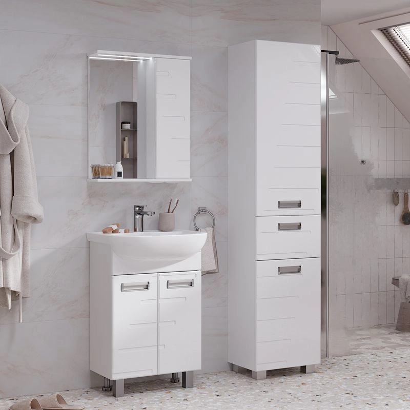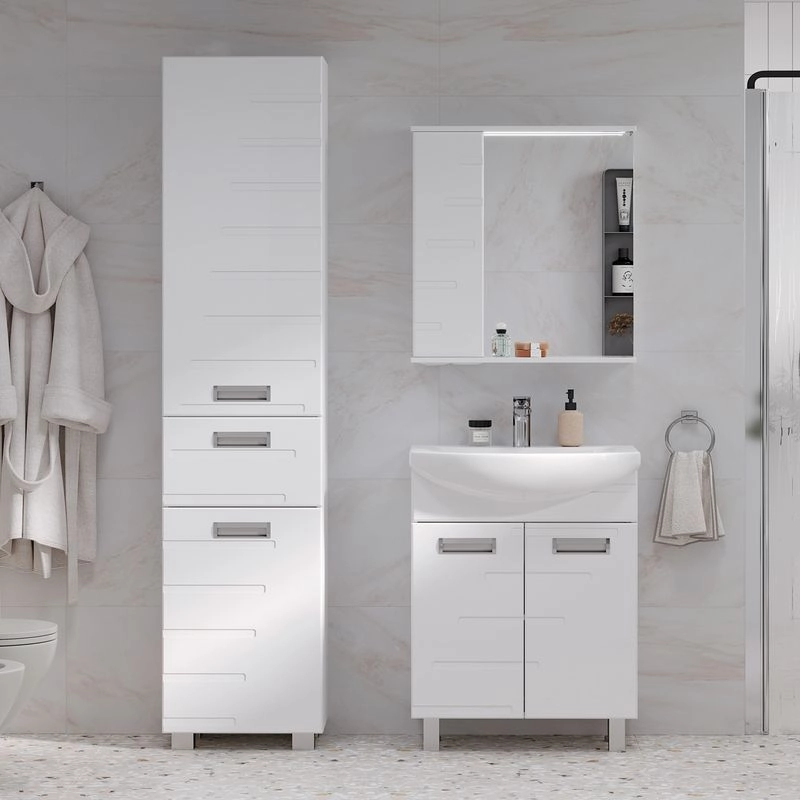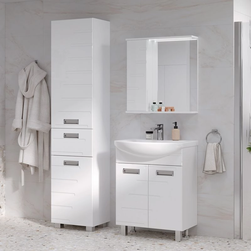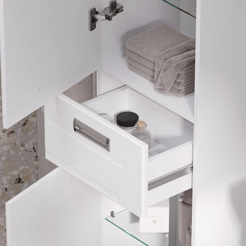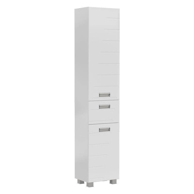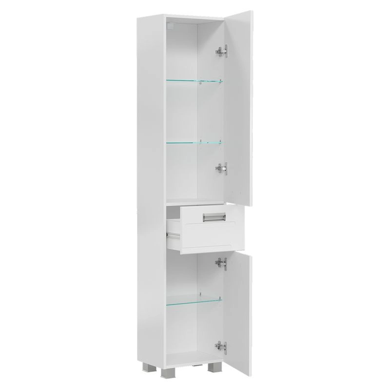 Напольный пенал с двумя стеклянными полками в верхней секции, выдвижным ящиком и одной стеклянной полкой в нижней секции. Петли оснащены доводчиками. Дверцы пенала изготовлены их МДФ и и облицованы глянцевой пленкой ПВХ. Лицевая фурнитура серебро/хром.Пенал устанавливается на четыре регулируемые опоры и фиксируется к стене при помощи креплений. Декоративна фрезеровка на фасаде, фурнитура с доводчиками.