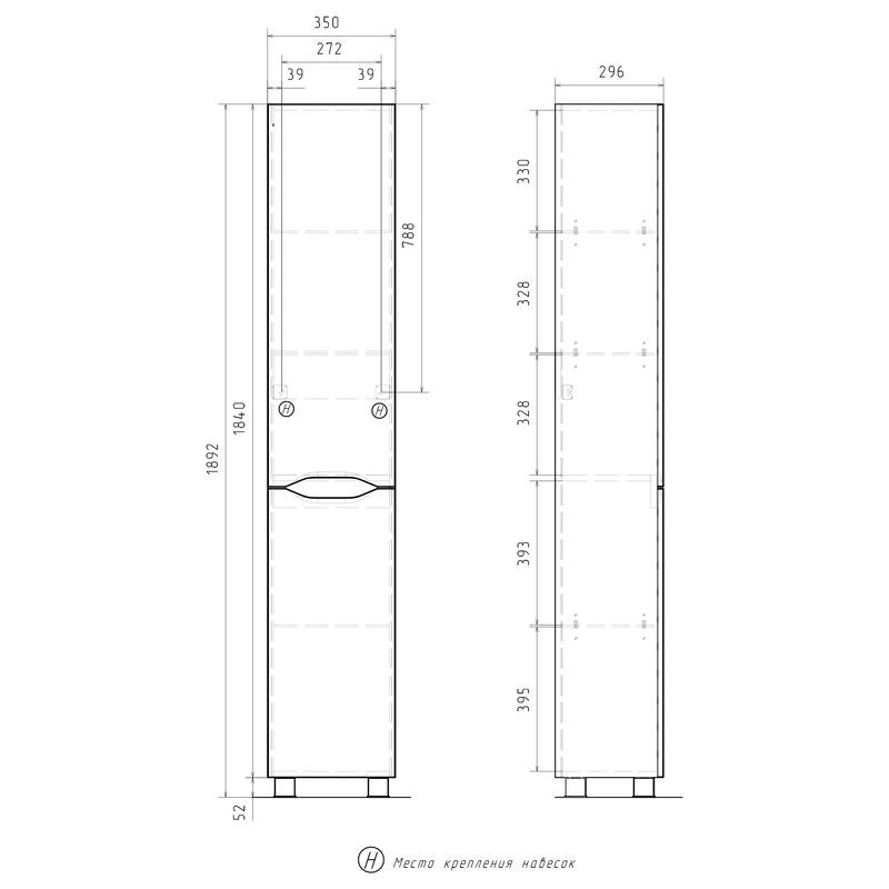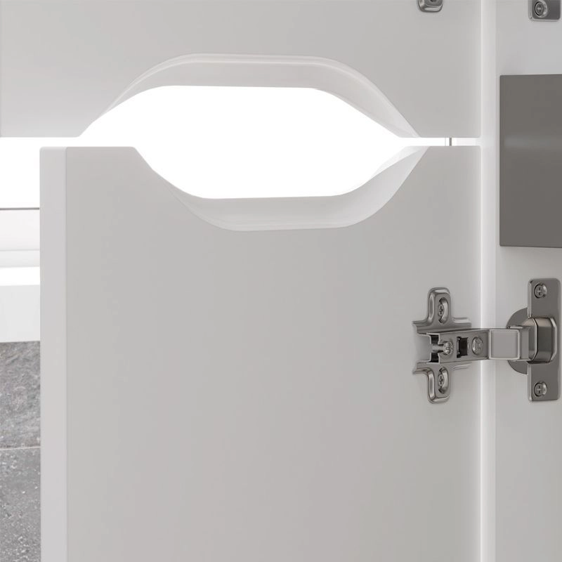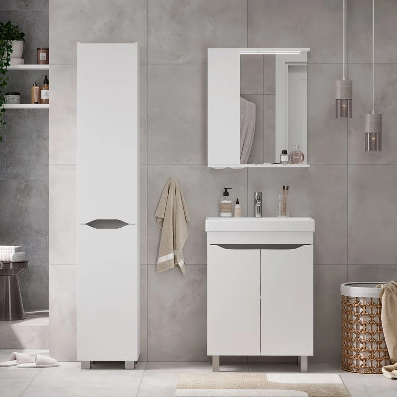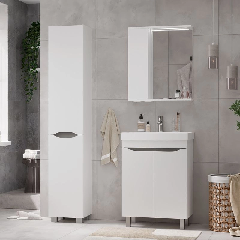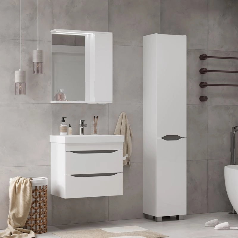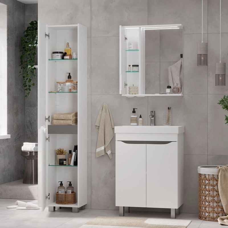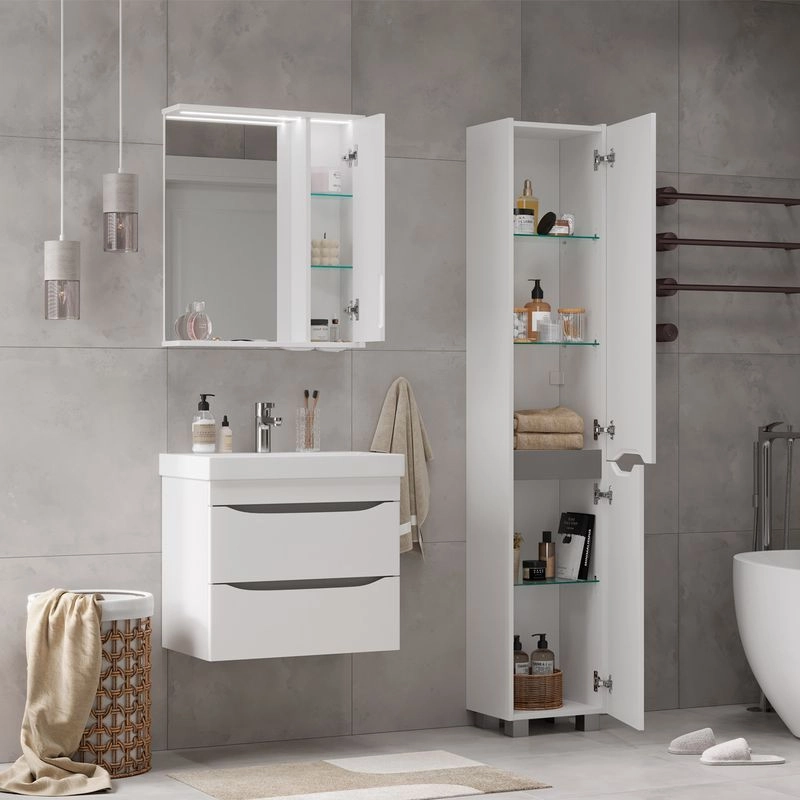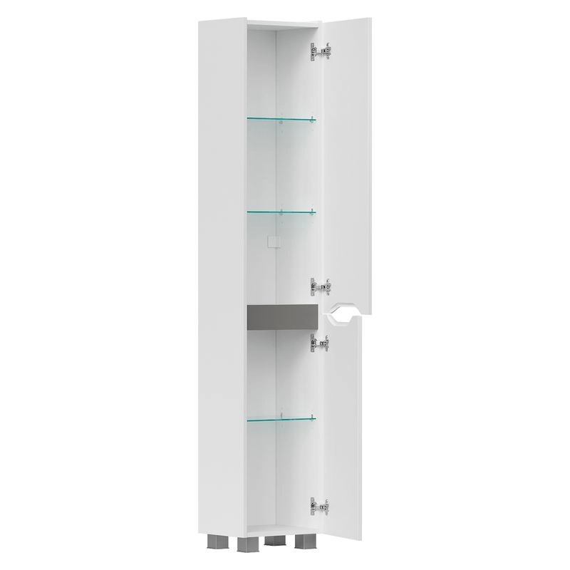 Напольный пенал с двумя стеклянными полками в верхней секции и одной стеклянной полкой в нижней секции. Петли с доводчиками для плавного и бесшумного закрывания. Фасады пенала изготовлены из МДФ и облицованы глянцевой пленкой ПВХ. Дверцы пенала открываются при помощи интегрированных ручек. Пенал устанавливается на четыре регулируемые опоры и фиксируется к стене при помощи креплений. Интегрированные ручки, фурнитура с системой плавного закрывания. Декоративный элемент в цвете серый бетон.