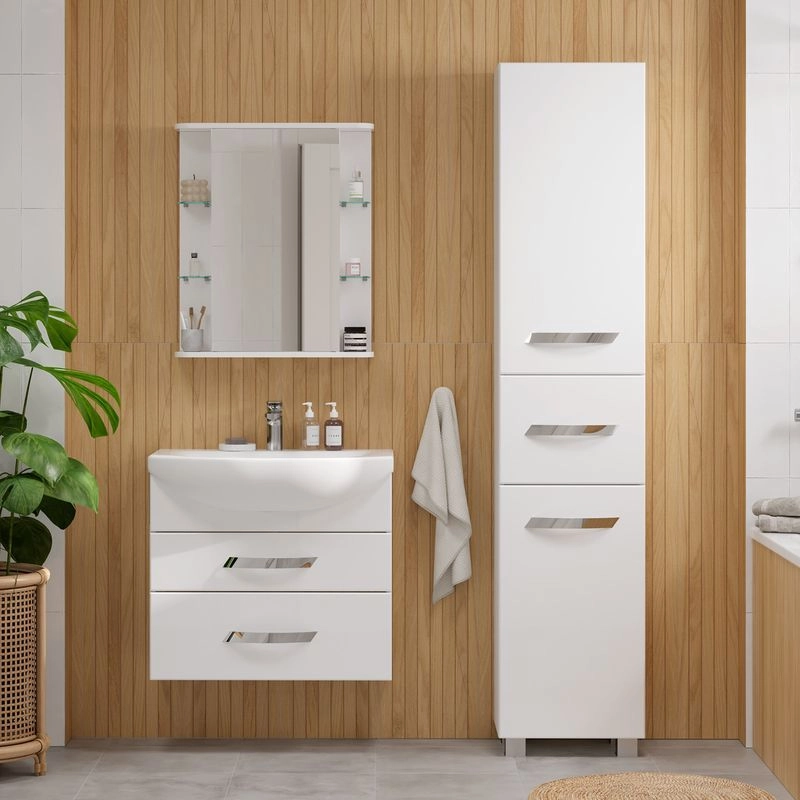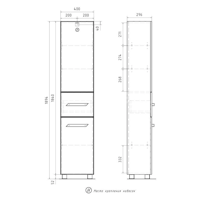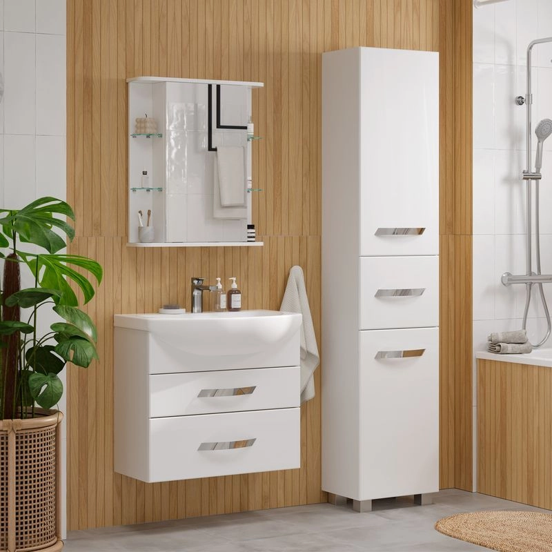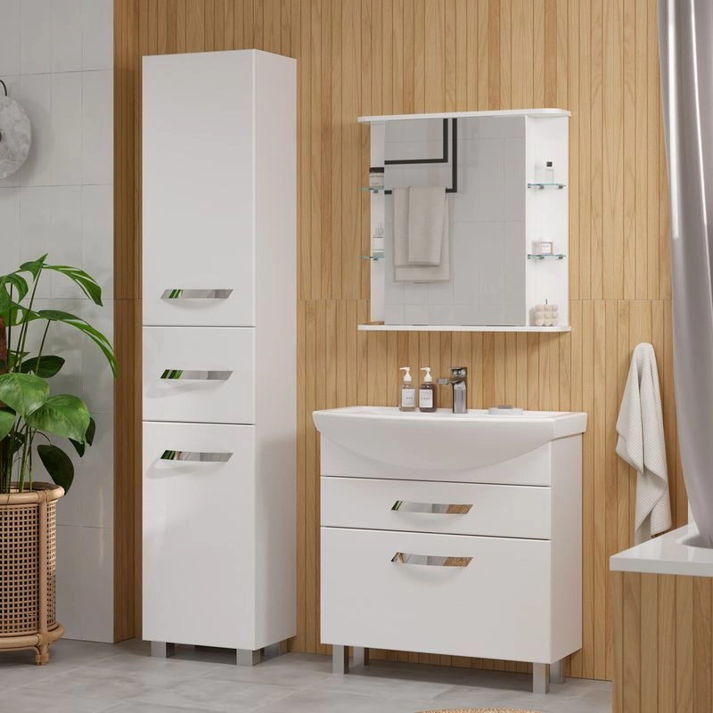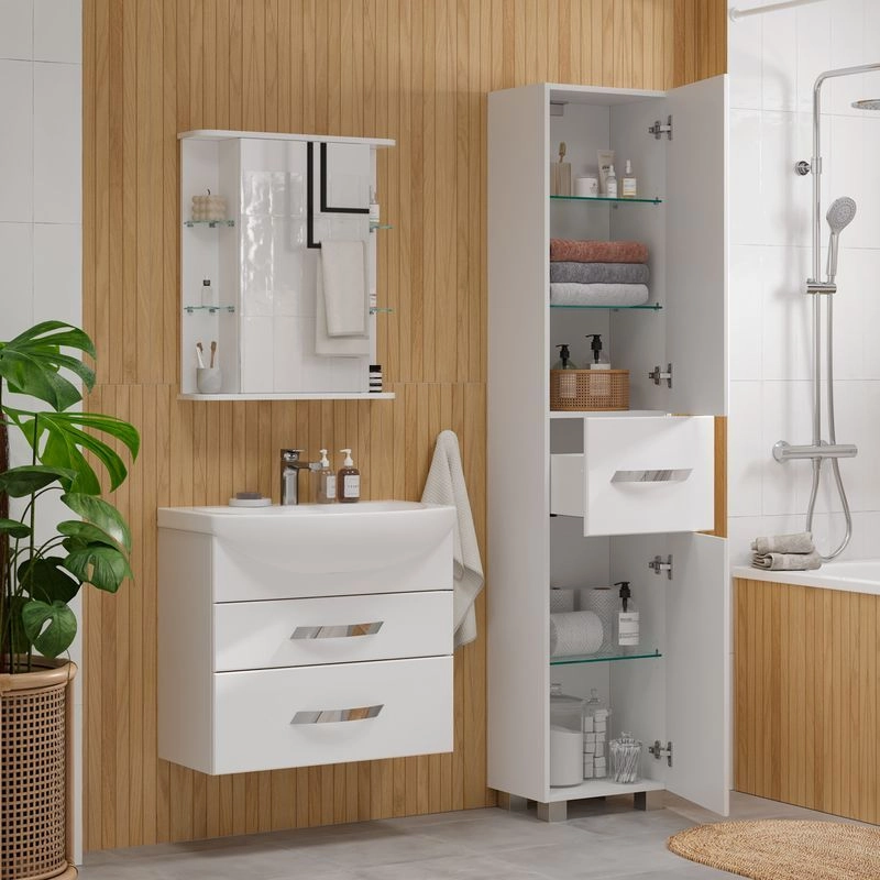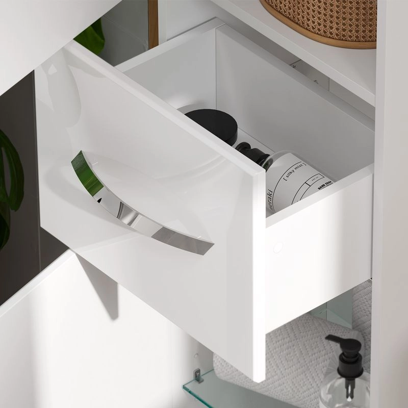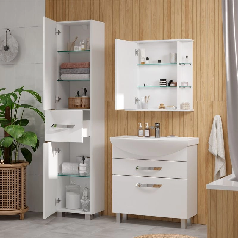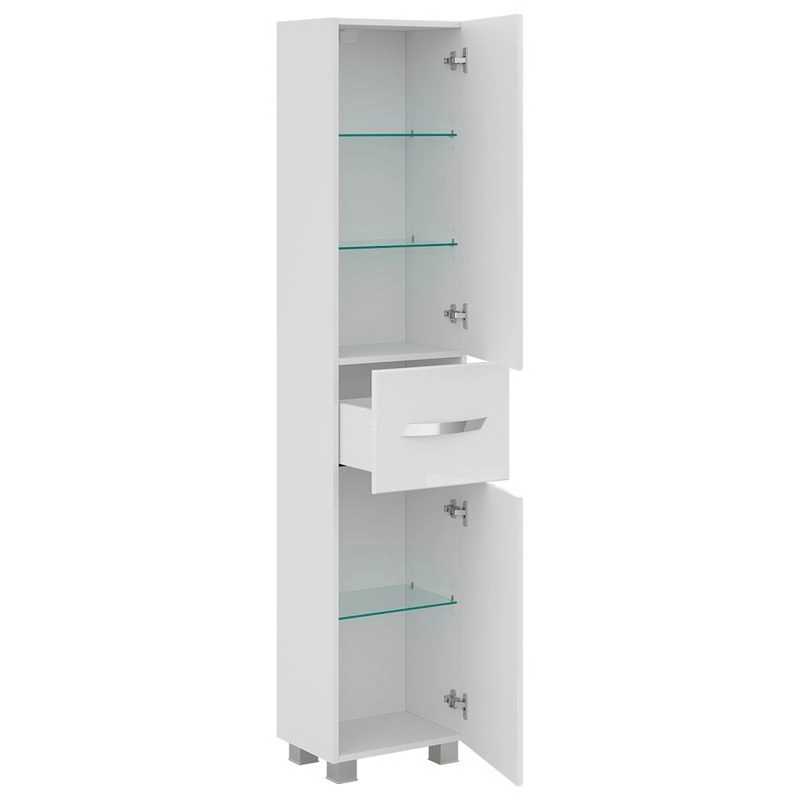 Напольный пенал с двумя стеклянными полками в верхней секции, выдвижным ящиком и одной стеклянной полкой в нижней секции. Петли оснащены доводчиками. Дверцы пенала изготовлены из МДФ и облицованы глянцевой пленкой ПВХ. Лицевая фурнитура хром. Пенал устанавливается на четыре регулируемые опоры и фиксируется к стене при помощи креплений. Фурнитура с механизмом плавного закрывания