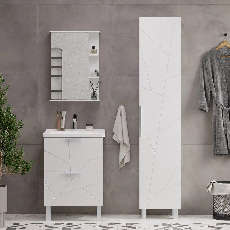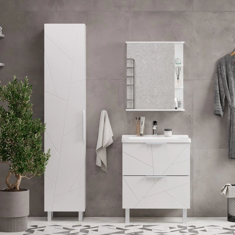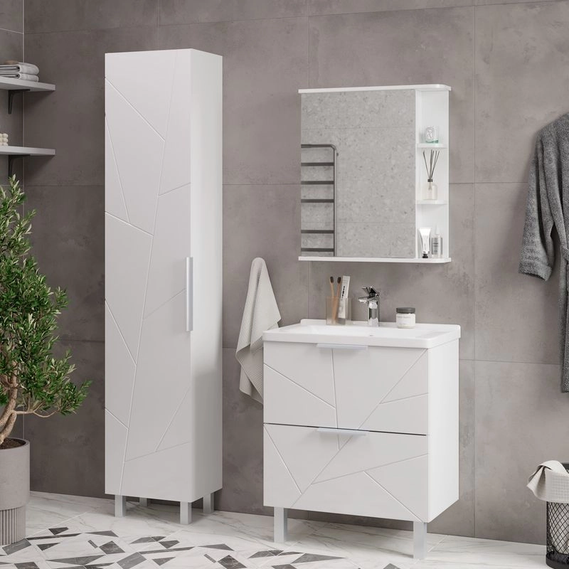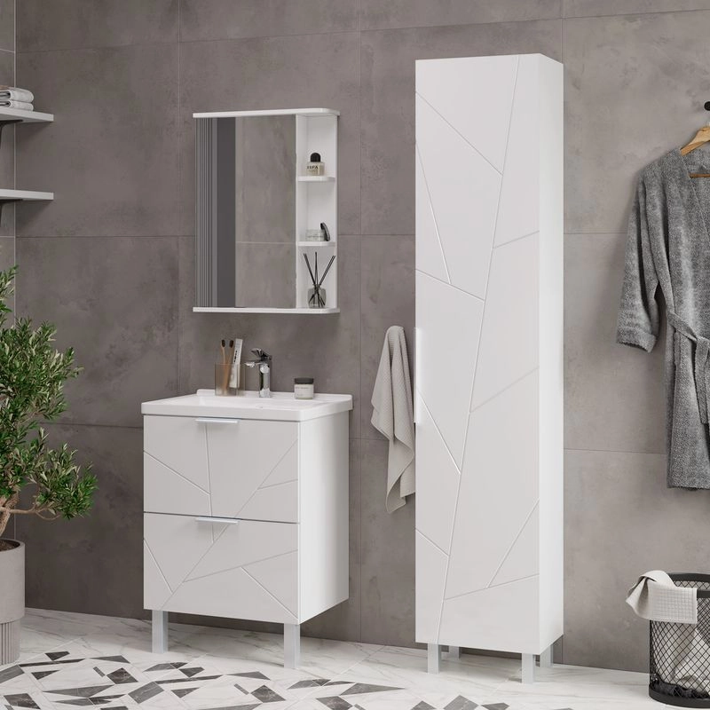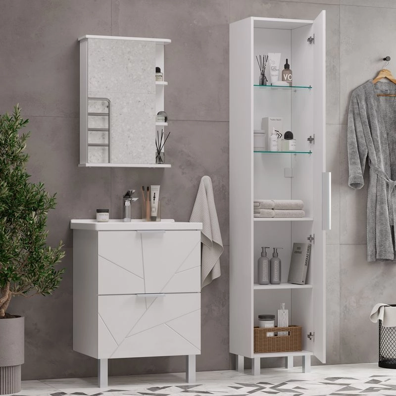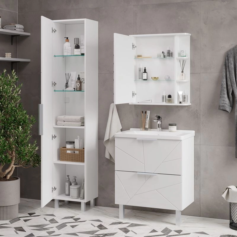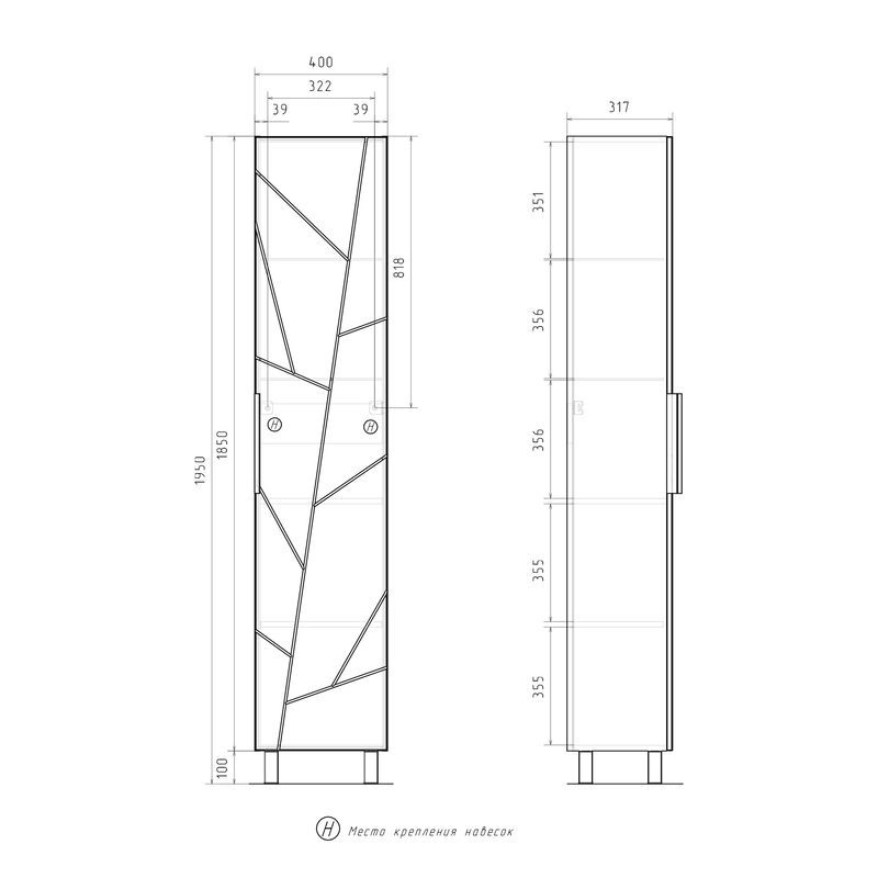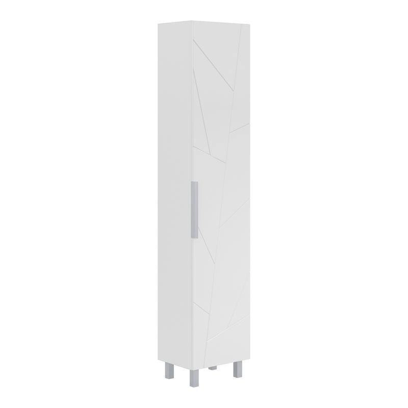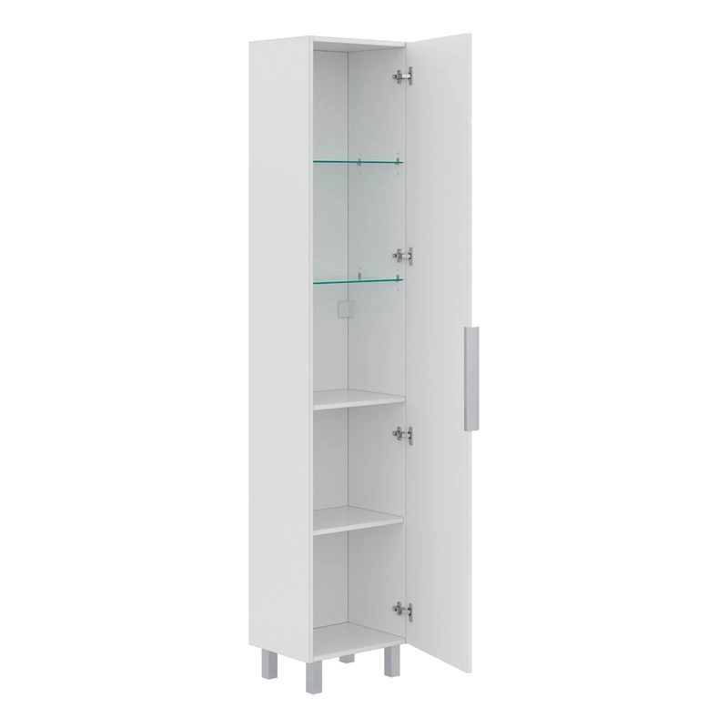 Напольный пенал с двумя стеклянными полками и двумя полками из ЛДСП за распашной дверцей. Петли с доводчиками для плавного и бесшумного закрывания. Фасад пенала изготовлен из МДФ и облицован глянцевой пленкой ПВХ. Лицевая фурнитура серый матовый. Пенал устанавливается на четыре регулируемые опоры и фиксируется к стене при помощи креплений. Декоративная фрезеровка на фасаде, фурнитура с системой плавного закрывания
