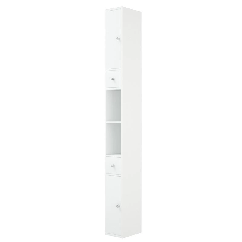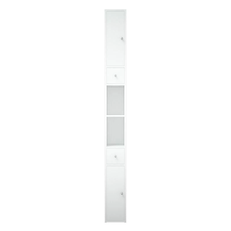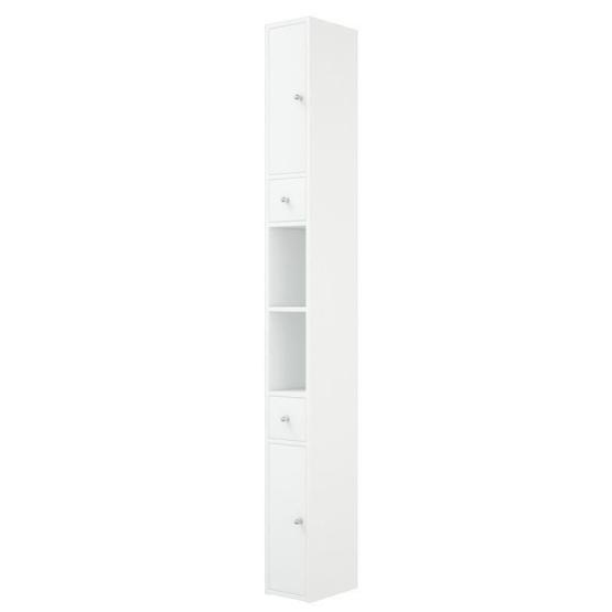 У пенала 2 распашные двери, позади полки. Есть 2 выдвижных ящика на шариковых направляющих. Высота ящиков 110 мм. Все двери на петлях с доводчиками. По центру пенала есть ниша, разделенная на 2 части полкой. Пенал является универсальным, то есть может быть установлен как правым, так и левым, путем переворачивания.