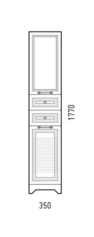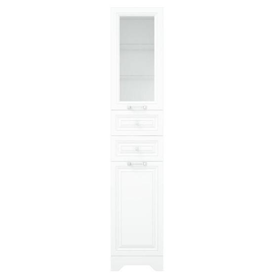 У пенала 1 распашная дверь сверху, позади вкладные полки. Дверь со стеклом. По центру 2 выдвижных ящика на направляющих скрытого монтажа. Высота ящиков 110 мм. Нижняя дверь откидная с корзиной. Все двери на петлях с доводчиками. У пенала снизу 4 регулируемые опоры. Фасады - плёнка ПВХ Белая, корпус - ЛДСП.
