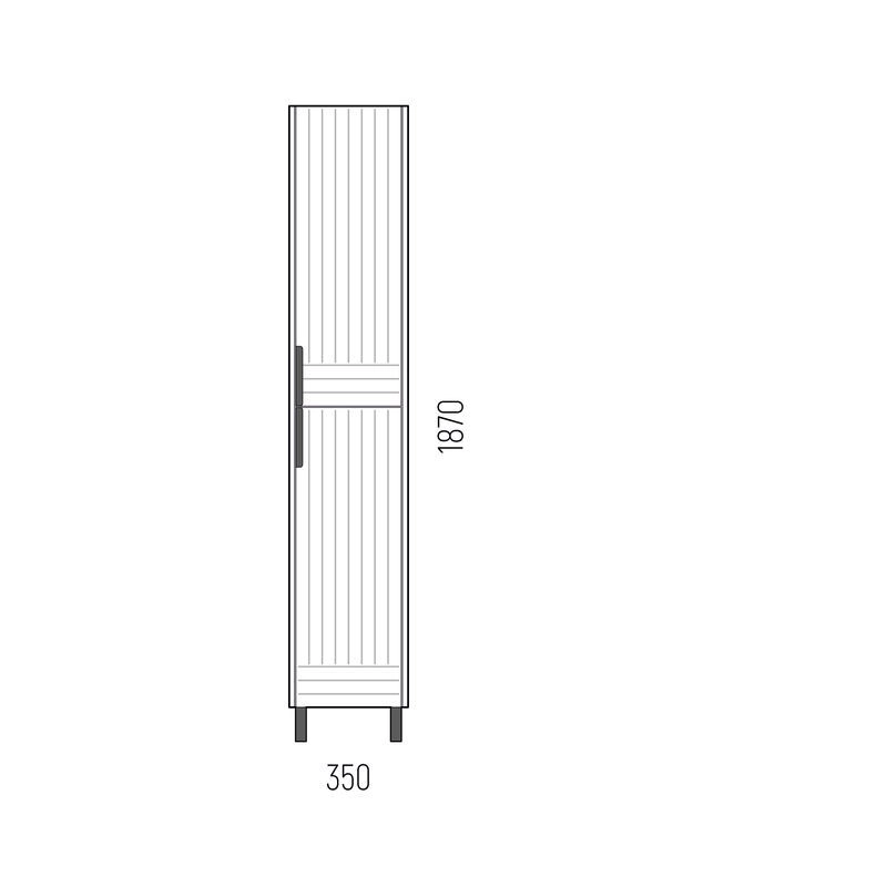 Шкаф-пенал коллекции Терра оснащен двумя дверками с доводчиками. Позади вкладные полки с возможностью регулировки по высоте. Шкаф-пенал является универсальным, то есть перевернув его, можно расположить двери справа или слева, путем перекручивания опор. Ручки и опоры выполнены из металла цвета Черный муар.