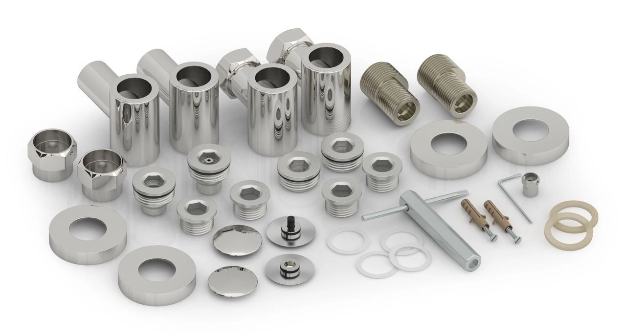 Комплектация : Полотенцесушитель-1 шт.;Корпус угловой проходной -2 шт.;Корпус угловой глухой-2 шт.;Штуцер для коллектора-4 шт.;Прокладка фторопластовая для коллектора-4 шт.;Заглушка угла-3 шт.;Заглушка декоративная-4 шт.;Прокладка силиконовая G 3/4?-2 шт.;Отражатель декоративный TUBE (для эксцентрика)-2 шт.;Эксцентрик G 1/2? ? G 3/4?-2 шт.;Спускной клапан-1 шт.;Ключ ШГ №2,5-1 шт.;Ключ ШГ №3-1 шт.;Ключ ШГ №12-1 шт.;Конус-фальшгайка опоры TUBE-2 шт.;Основа опоры TUBE-1 шт.;Паспорт-1 шт.