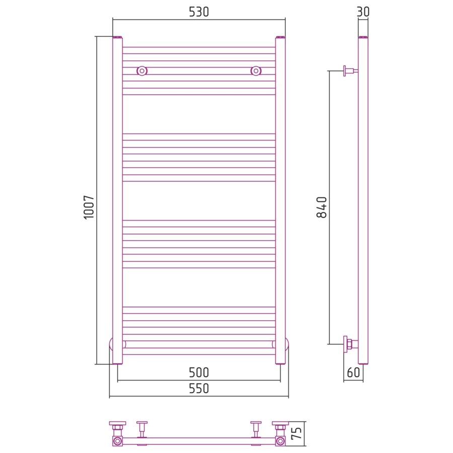 Комплектация : Полотенцесушитель-1 шт.;Носик 3/4? н/г-2 шт.;Заглушка для коллектора-2 шт.;Спускной клапан-2 шт.;Прокладка силиконовая G 3/4?-2 шт.;Отражатель-2 шт.;Эксцентрик G 1/2? ? G 3/4?-2 шт.;Ключ ШГ №12-1 шт.;Кронштейн телескопический-2 шт.;Паспорт-1 шт.