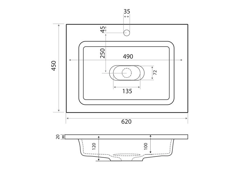 Глубина чаши раковины, мм 100