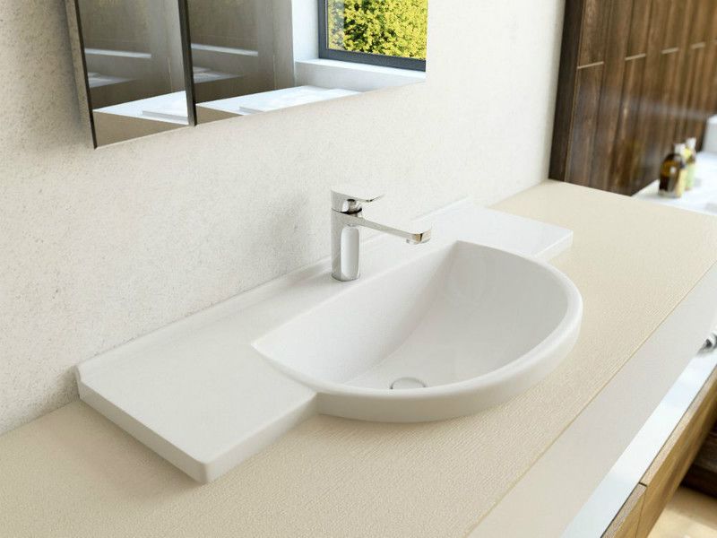 Раковина Эстет Куба 90х43 из литиевого мрамора для установки на столешницу. Толщина изделия 2-3 см. Состав: композитный материал 80% мраморной крошки, 15% полиэфирных смол, 5% присадок. Доступны для покраски по таблице RAL.