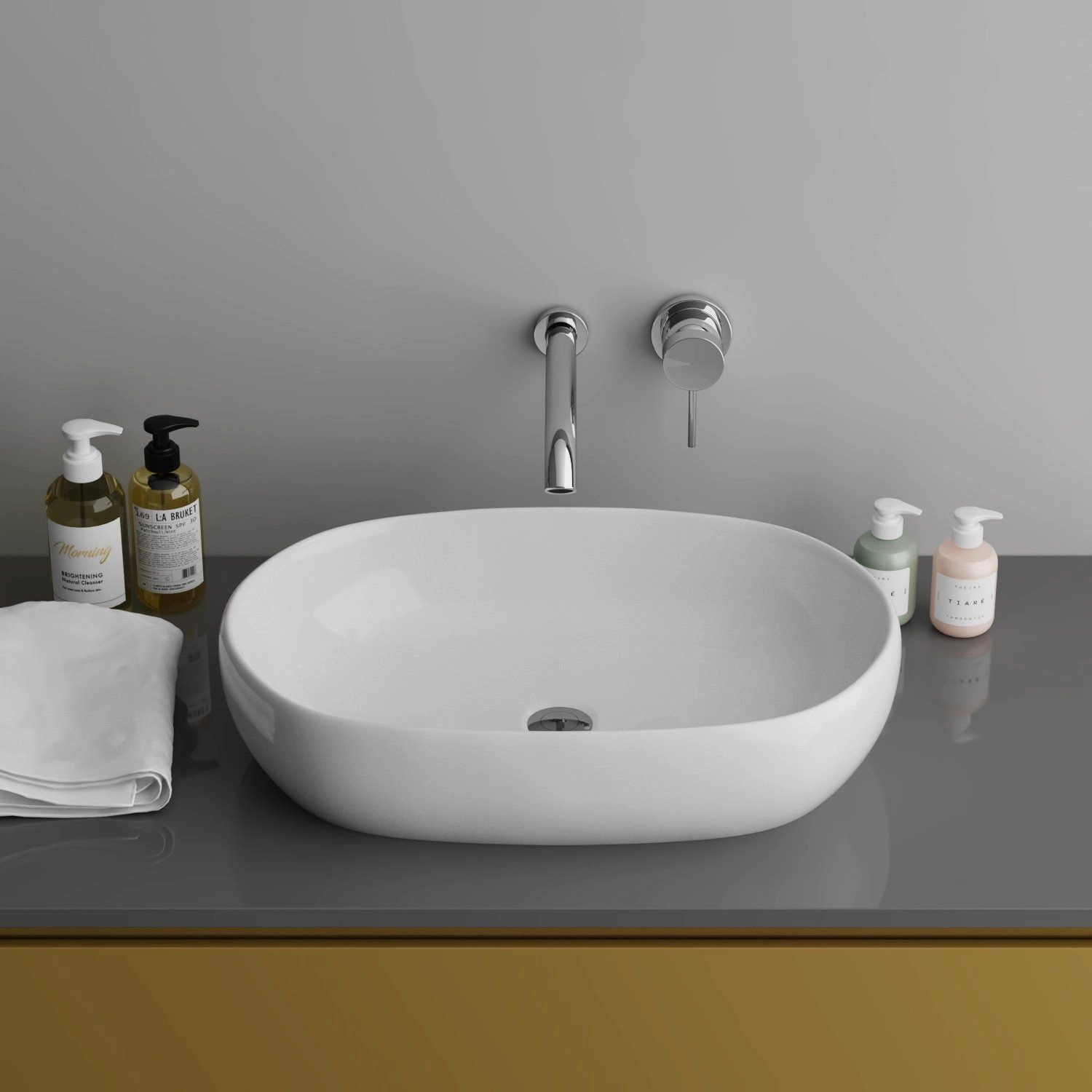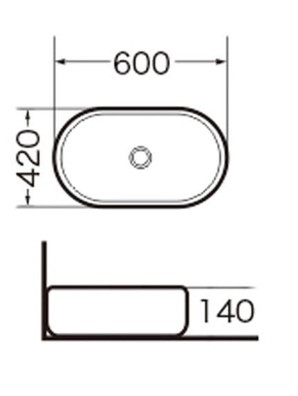 Донный клапан - приобретается отдельно. Раковина накладная. Размер: 600 х 420 х 140 мм