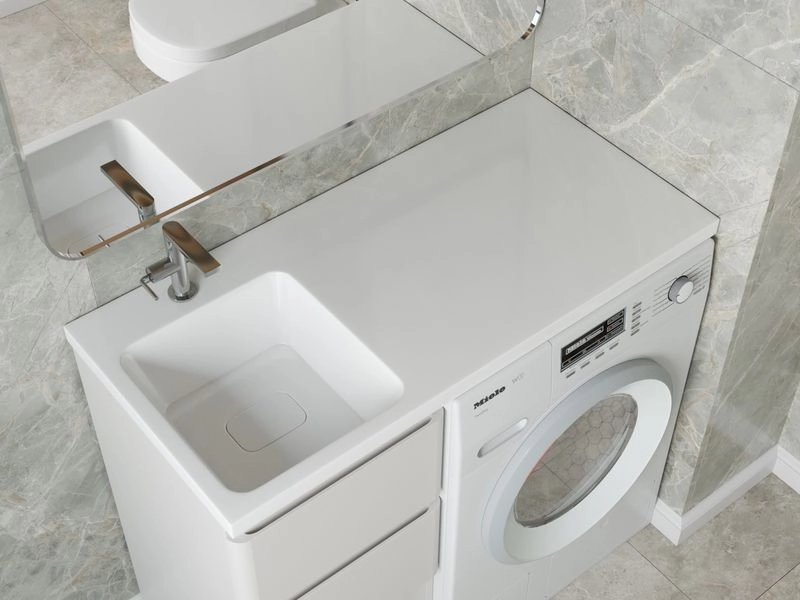 Раковина для ванной комнаты для установки над стиральной машинкой. Элегантная декоративная крышка и глубокая чаша, образуют между собой прекрасный баланс дизайна и практичности. Верхний слой гелькоута формирует декоративно защитное покрытие. Раковина крепится на кронштейны. Может эксплуатироваться как самостоятельное изделие, так и со встроенной мебелью.