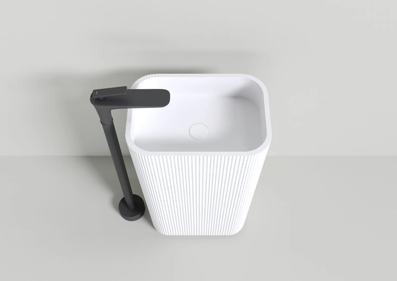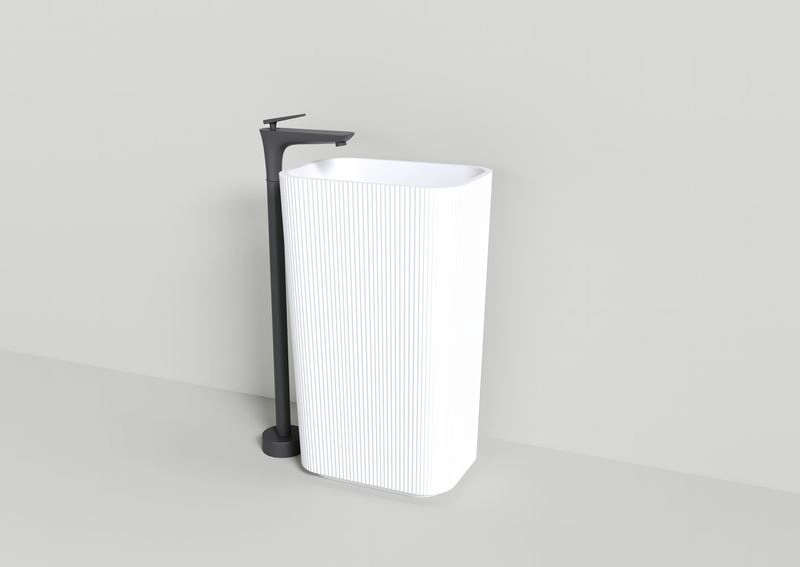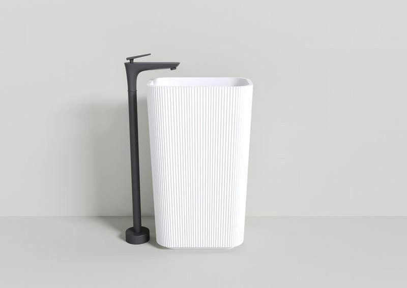 Эта напольная раковина прямоугольной формы воплощает эстетику прямых линий. Прочность и красота в этой модели соседствуют с тонкостью линий и изяществом ребристой конструкции. Являясь произведением искусства, такая раковина будет выигрышно смотреться в просторной ванной комнате, подчёркивая эксклюзивность интерьера. Наличие цоколя даёт возможность добавить под раковину подсветку и придать особый шик вашей ванной комнате.