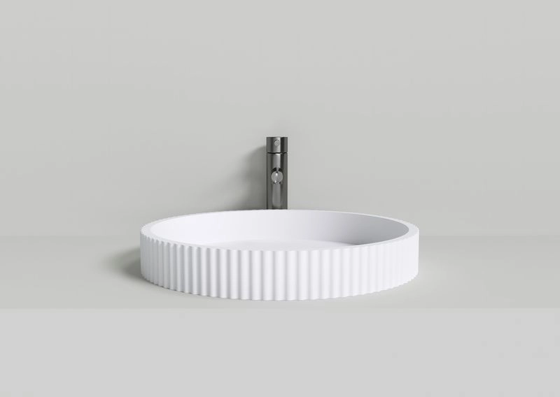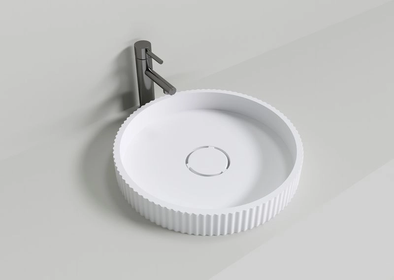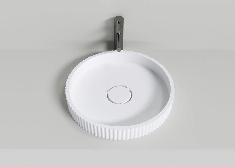 Раковина Fanello воплощает собой идеальный круг, очерченный тонкими краями с элегантной ребристой поверхностью. Помимо эстетической привлекательности, раковина функциональна и практична. Благодаря уникальным свойствам искусственного камня раковина легко моется и не боится воздействия даже самых сильных чистящих средств. Создайте необычный изысканный интерьер вашей ванной комнаты с раковиной Fanello в сочетании с отдельно стоящей ванной Cielo.Изготовлен по Технологии Solid Surface (твердая поверхность) - технология изготовления нового класса композиционных материалов, имитирующих натуральный камень. Представляет собой оригинальный материал со сплошной поверхностью - это композит на основе специальных наполнителей (гранул различных цветов и размеров) и смолы (полиэфирной, модифицированной акрилатами) и изготавливается по определенной технологии