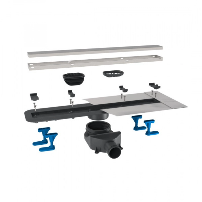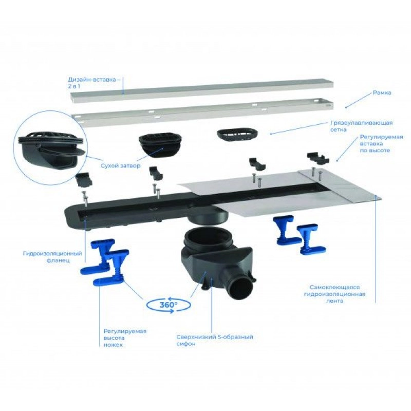 1. Душевой трап – 1 шт. 2. S-образные сифон 3. Опоры для регулировчки высоты 4. Переходник с уплотнительной резинкой 5. Грязеулоавливающая сеточка 6. Сухой затвор 7. Дизайн вставка 8. Устройство для снятия решетки – 1 шт. 9. Набор крепежей – 1 компл. 10. Гидроизоляционная лента MAPEI – 1 компл. 11. Защитный элемент на время монтажа – 1 шт. 12. Инструкция по монтажу – 1 шт. 13. Гарантийный талон – 1 шт. 14. Упаковка – 1 шт.