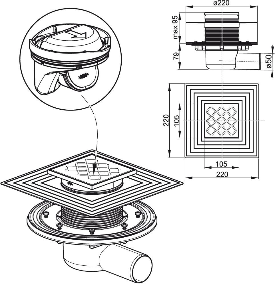 решетка изготовлена из нержавеющей стали, пропускная способность 37 л/мин., комбинированный гидрозатвор с высотой слива 30 мм., фланец из нержавеющей стали и бортик второго уровня изоляции.