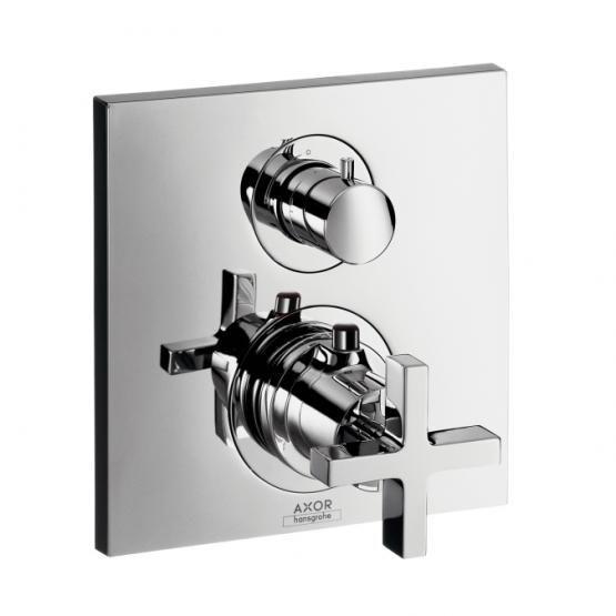 2 потребителя картридж термостата, запорный и переключающий вентиль предохранительный ограничитель при 38°C регулируемое ограничение температуры расход воды: 26 л/мин комплект поставки: металлическая розетка, рукоятка, гильза, функциональный блок