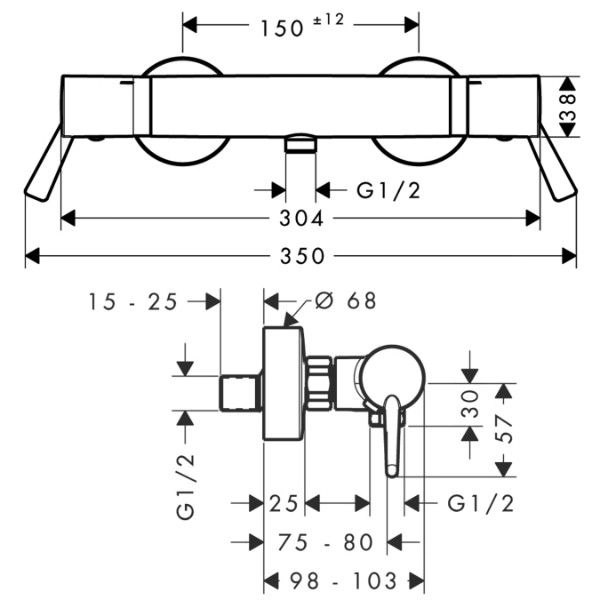 укоятка Care кнопка Ecostop (ограничивает расход воды до 10 л/мин), предохранитель на 38°C термостат с предохранителем на 40°C картридж SMTC, защита от обратного тока воды предустановленное ограничение температуры горячей воды монтажные размеры 150 ± 12 мм эксцентрики с шумоподавлением расход воды около 20 л/мин