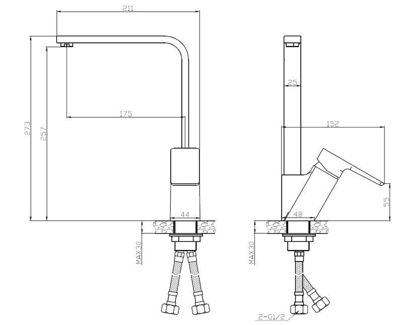 Корпус: латунь кат.A Излив: поворотный, нерж.сталь Картридж: универсальный ESKO, 35мм Комплектация: ребро жесткости, крепление две шпильки, гибкая подводка 35см.
