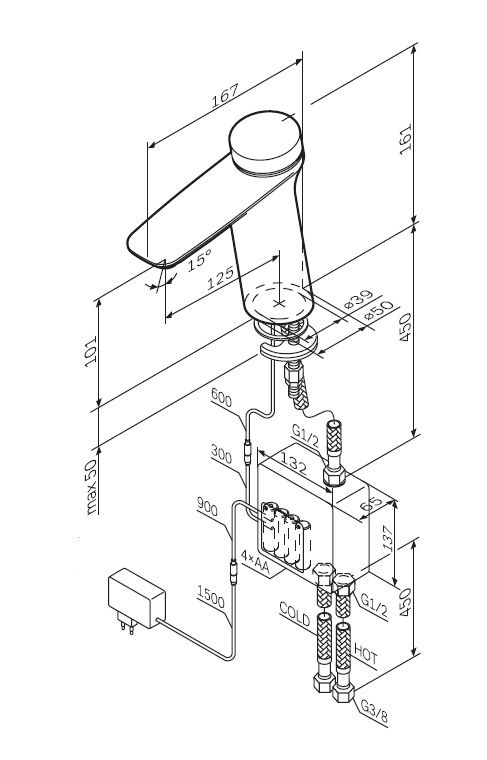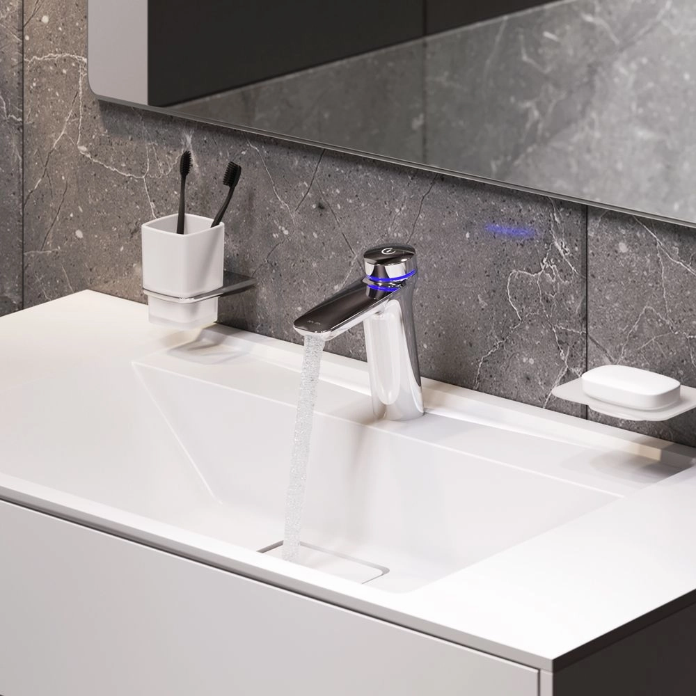 Идеальная геометрия, разработанная по стандарту SA (Smart Angle) – математические выверенное соотношение высоты смесителя, длины излива и наклона корпуса для удобного использования на умывальнике любого размера.
