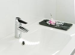 Смеситель для умывальника с удобной рукояткой, фиксированным изливом и аэратором.