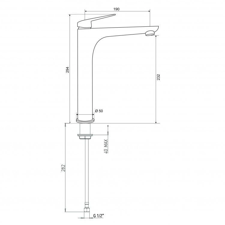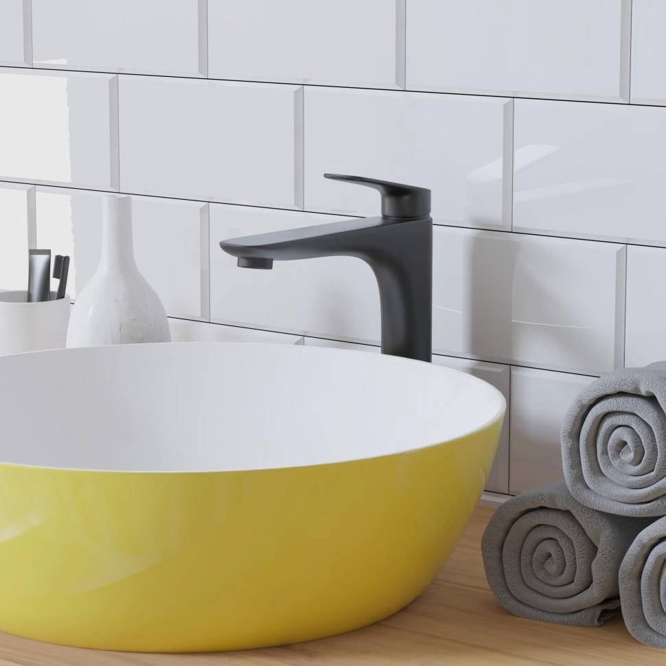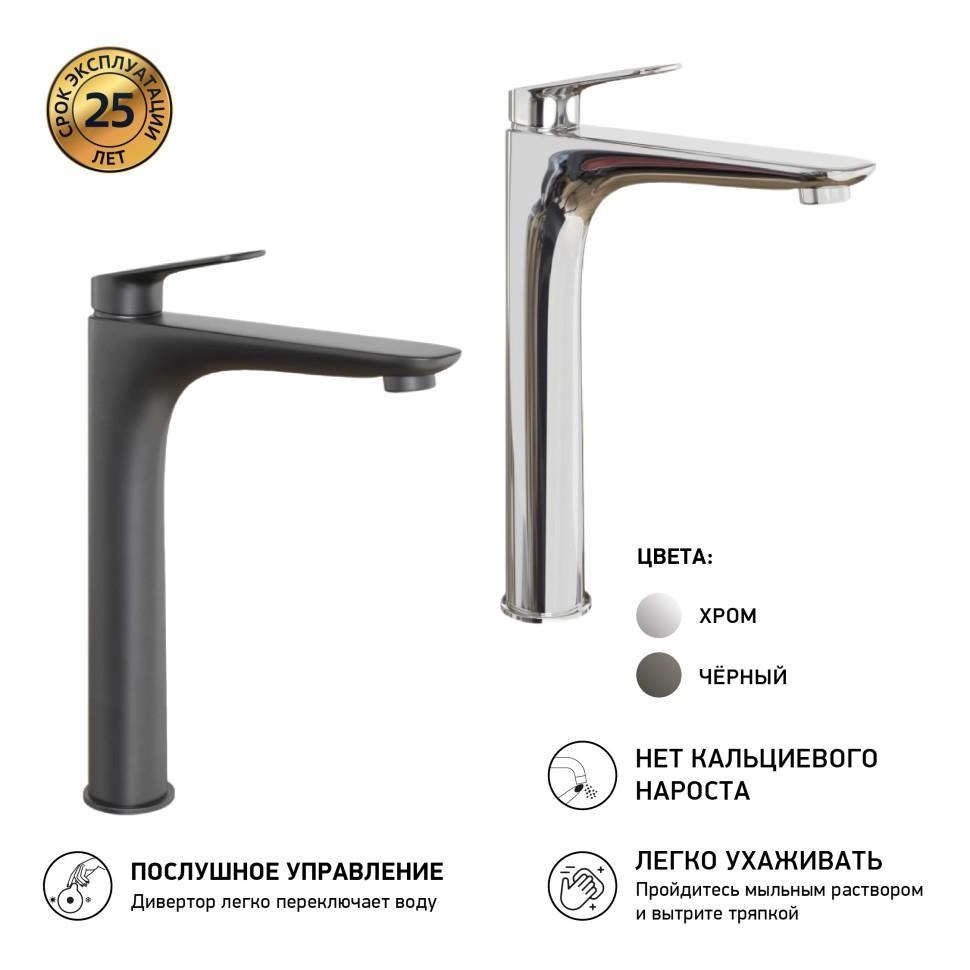 Увеличенная высота корпуса смесителя позволяет использовать его с накладными раковинами и раковинами-чашами.