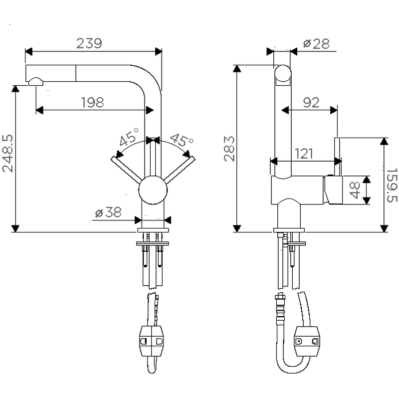 Соединительные шланги: гибкие, в оплетке из нержавеющей стали;