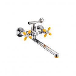 Смеситель для ванны с длинным поворотным изливом. Цвет ручек и аэратора: жёлтый. Хром.