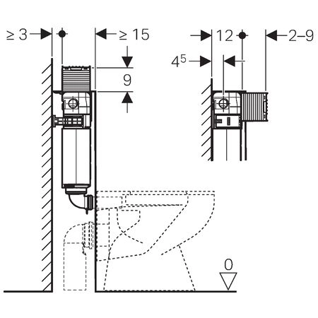 Большой объем воды для смыва, диапазон настройки 4,5 / 6 / 7,5 л . Малый объем воды для смыва, диапазон настройки 3-4 л. Подключение к системе водоснабжения R1/2 со встроеннымугловым запорным вентилем и ручным маховичком. Коробка монтажная для окна обслуживания. Удлинитель колена смыва ш 45 мм. 1 защитная заглушка. 2 крепежных уголка. Крепежные элементы.