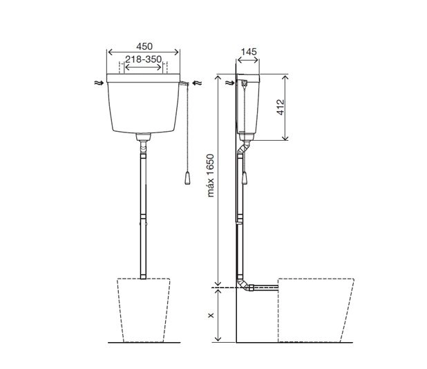 - бачок для наружного высокого монтажа с одинарным смывом 9 литров (регулируется до 6 литров на впускном клапане);
