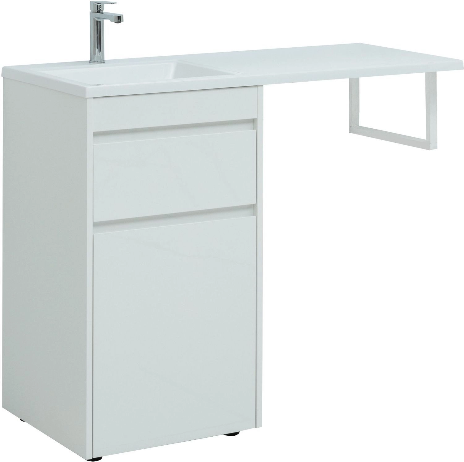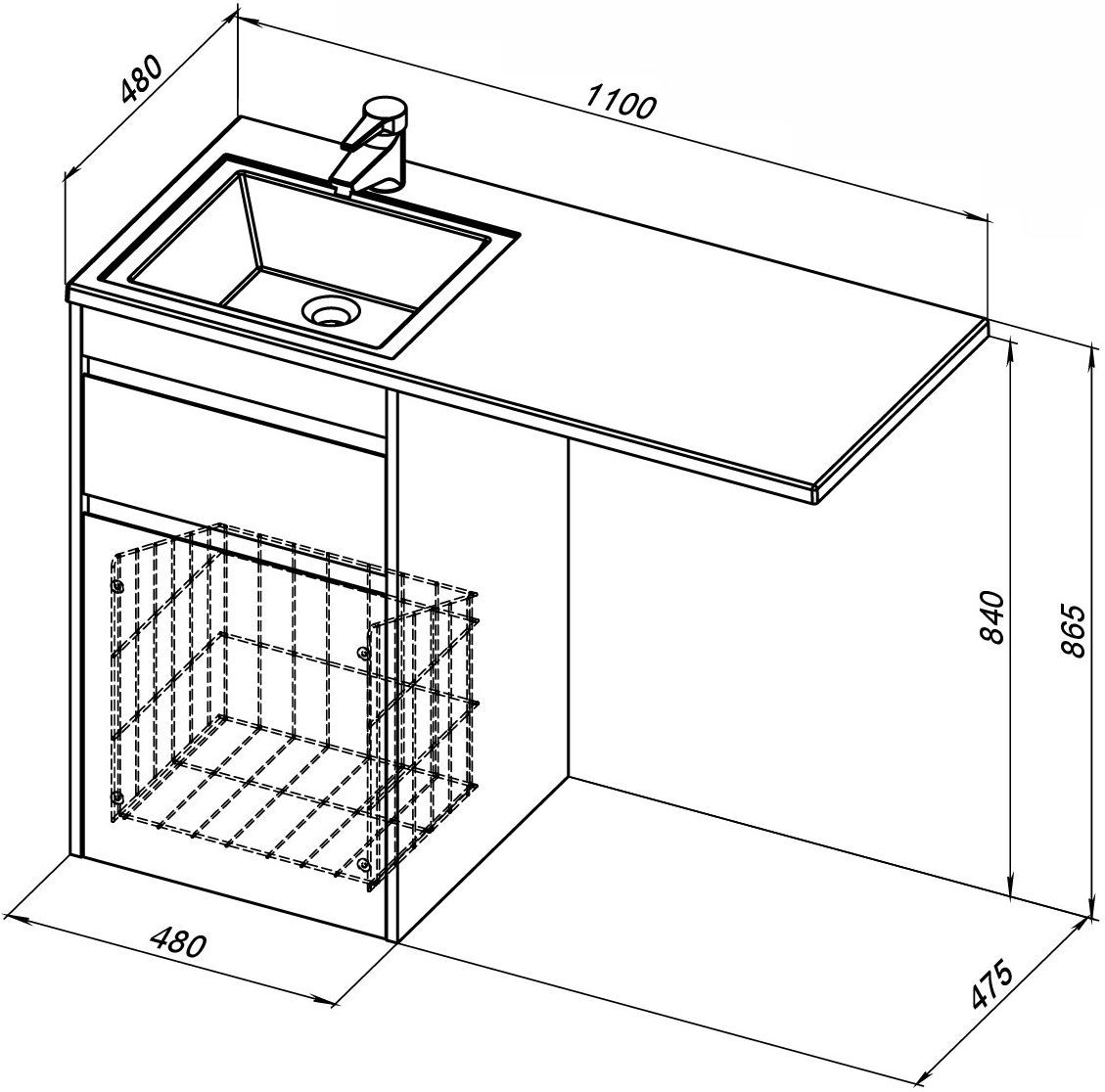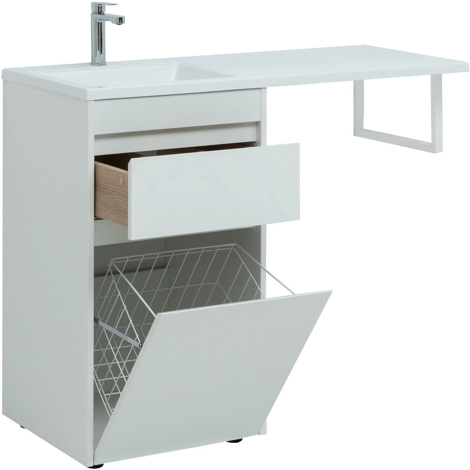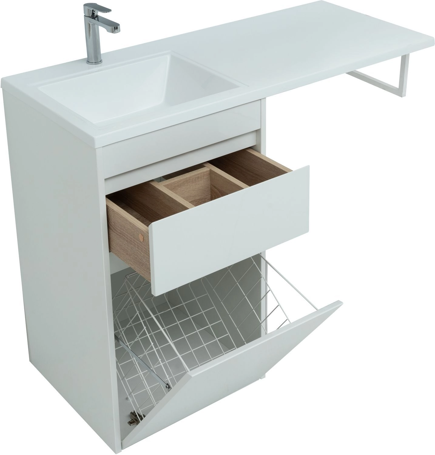 Тумба под раковину Aquanet Токио 110 белого цвета представляет новый формат тумб производства Aquanet. Раковина из литьевого мрамора имеет длинную платформу, которая выходит далеко за пределы тумбы. Она предназначена для того, чтобы установить с правой стороны от тумбы стиральную машину. Платформа имеет такую длину, которая позволит спрятать под нее машинку средних размеров с фронтальной загрузкой. Корпус тумбы выполнен из влагостойкого ЛДСП, а фасады – из МДФ с покрытием эмалью. Две зоны хранения в тумбе шириной 480 мм - это выдвижной ящик с доводчиками для хранения важных мелочей и откидная дверка с закрепленной на ней бельевой корзиной. Тумбу можно использовать и без соседства со стиральной машиной, а свободное пространство под платформой раковины занять подкатной тумбой, приспособлениями для уборки помещения или столиком.