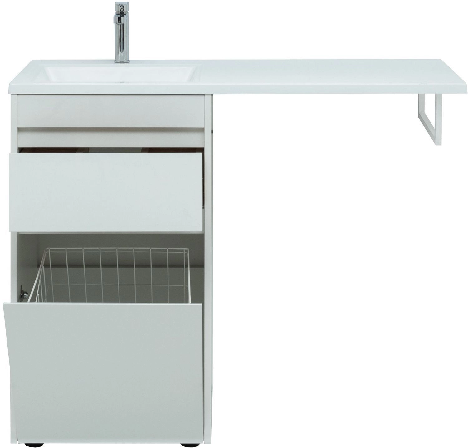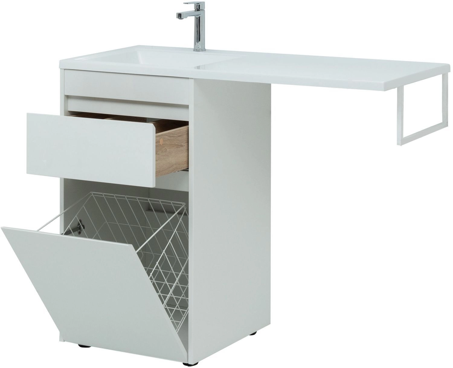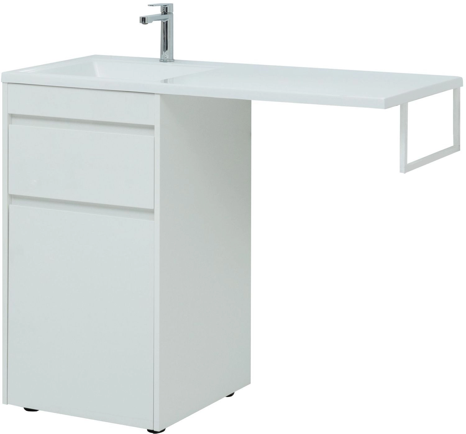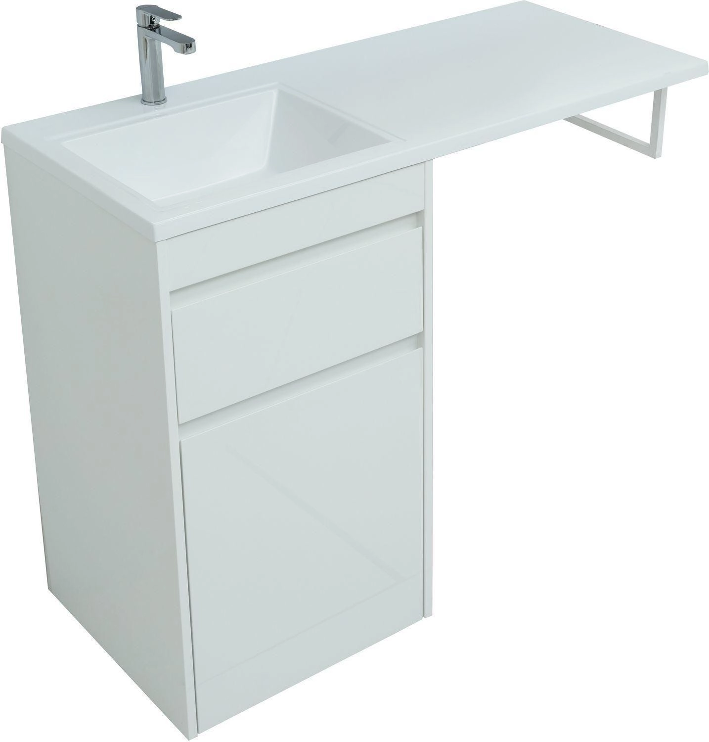 Тумба под раковину Aquanet Токио 110 белого цвета представляет новый формат тумб производства Aquanet. Раковина из литьевого мрамора имеет длинную платформу, которая выходит далеко за пределы тумбы. Она предназначена для того, чтобы установить с правой стороны от тумбы стиральную машину. Платформа имеет такую длину, которая позволит спрятать под нее машинку средних размеров с фронтальной загрузкой. Корпус тумбы выполнен из влагостойкого ЛДСП, а фасады – из МДФ с покрытием эмалью. Две зоны хранения в тумбе шириной 480 мм - это выдвижной ящик с доводчиками для хранения важных мелочей и откидная дверка с закрепленной на ней бельевой корзиной. Тумбу можно использовать и без соседства со стиральной машиной, а свободное пространство под платформой раковины занять подкатной тумбой, приспособлениями для уборки помещения или столиком.