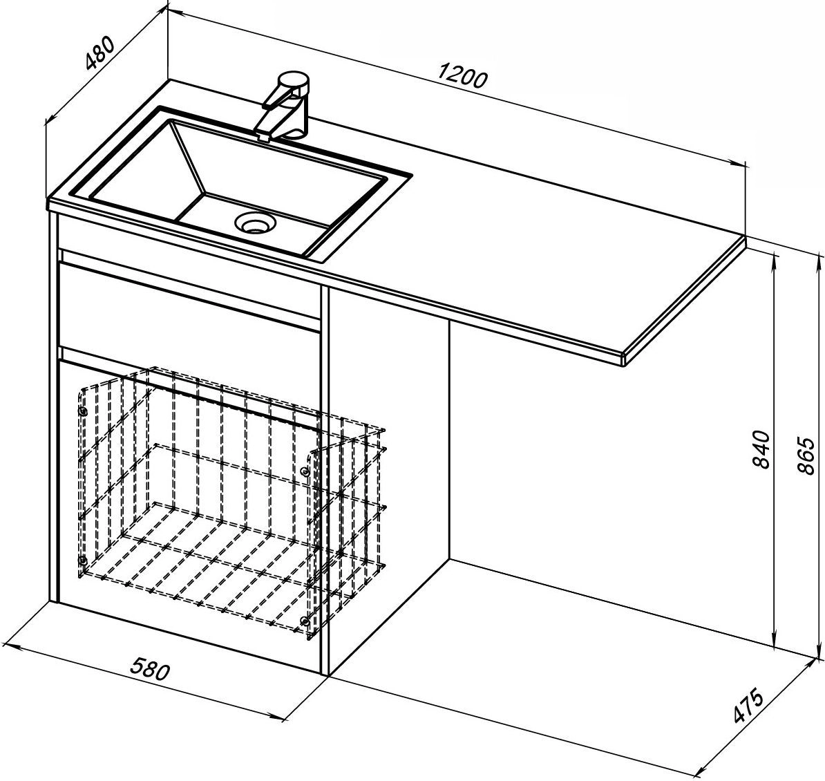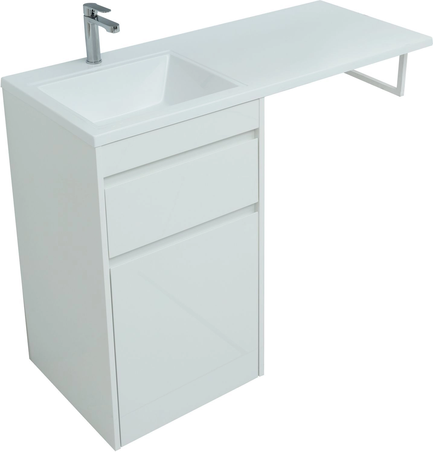Напольная Тумба под раковину Aquanet Токио 120 белого цвета представляет новый формат тумб производства Aquanet. Раковина из литьевого мрамора имеет длинную платформу, которая выходит далеко за пределы тумбы. Она предназначена для того, чтобы установить с правой стороны от тумбы стиральную машину. Платформа имеет такую длину, которая позволит спрятать под нее машинку средних размеров с фронтальной загрузкой. Корпус тумбы выполнен из влагостойкого ЛДСП, а фасады – из МДФ с покрытием эмалью. Две зоны хранения в тумбе шириной 580 мм - это выдвижной ящик с доводчиками для хранения важных мелочей и откидная дверка с закрепленной на ней бельевой корзиной. Тумбу можно использовать и без соседства со стиральной машиной, а свободное пространство под платформой раковины занять подкатной тумбой, приспособлениями для уборки помещения или столиком.