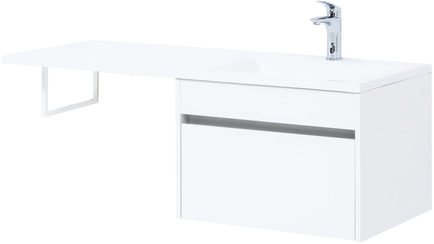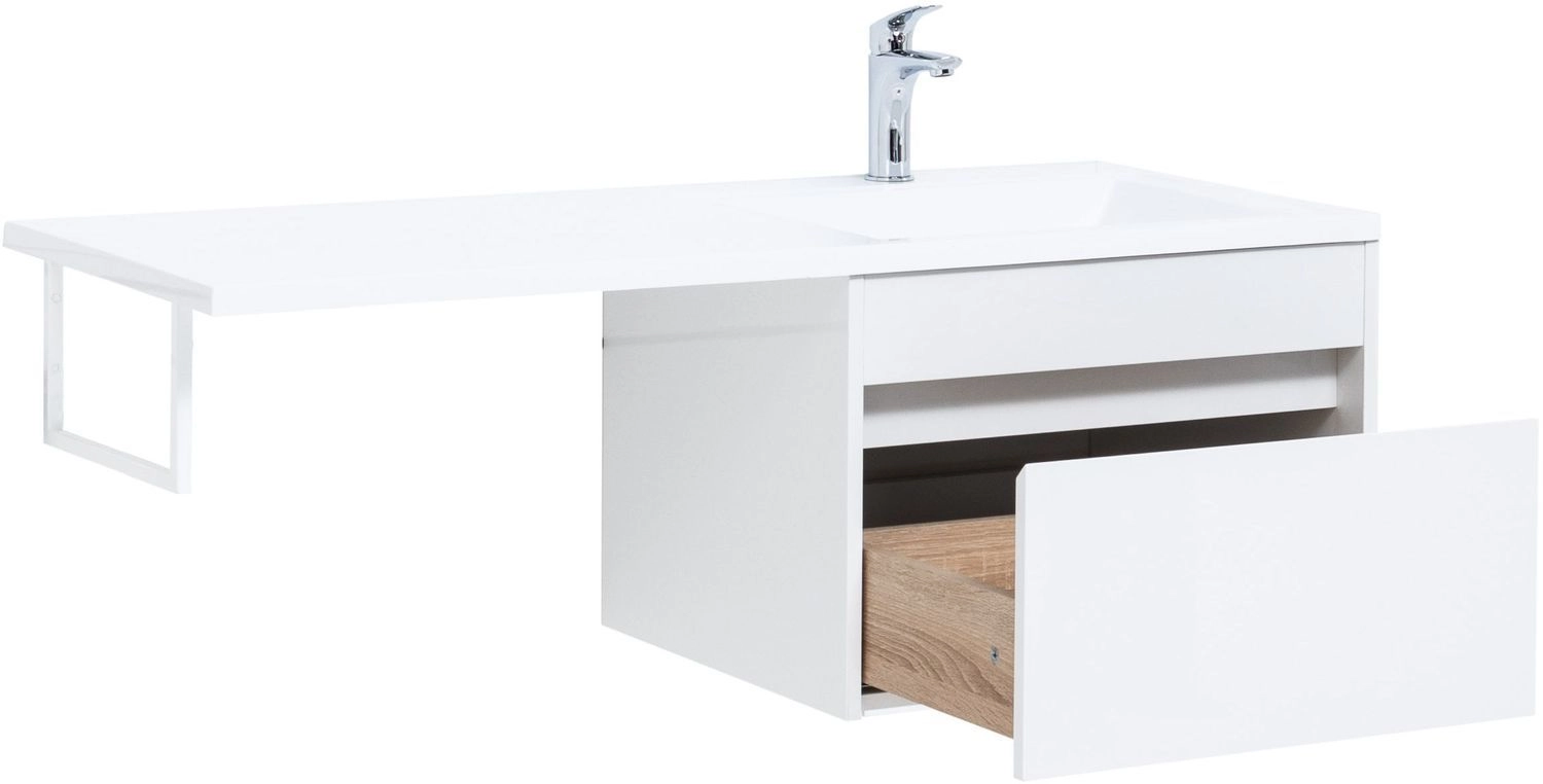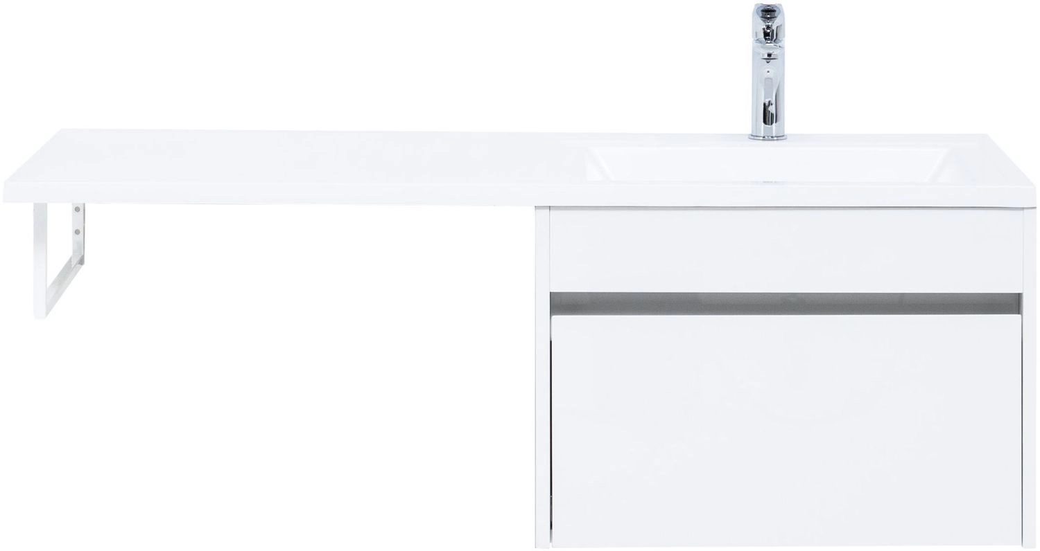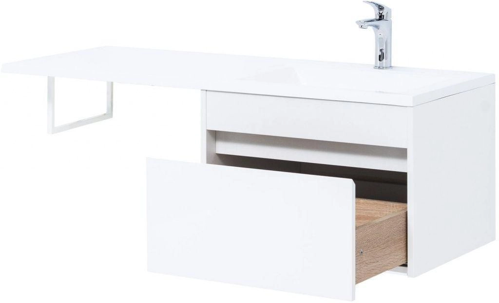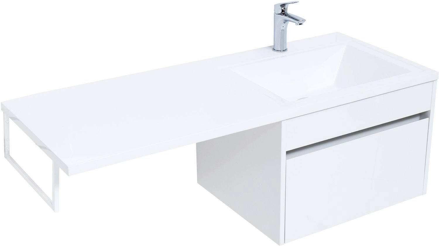 Тумба под раковину Aquanet Токио 120 (подвесная, 1 ящик) белого цвета представляет новый формат тумб производства Aquanet. Раковина из литьевого мрамора имеет длинную платформу, которая выходит далеко за пределы тумбы. Она предназначена для того, чтобы установить с правой стороны от тумбы стиральную машину. Платформа имеет такую длину, которая позволит спрятать под нее машинку средних размеров с фронтальной загрузкой. Корпус тумбы выполнен из влагостойкого ЛДСП, а фасад – из МДФ с покрытием эмалью. В подвесной тумбе шириной 580 мм место хранения предусмотрено в выдвижном ящике, оборудованном доводчиками, чтобы ход ящика при открывании/закрывании был плавным и без неприятных звуков. Тумбу можно использовать и без соседства со стиральной машиной, а свободное пространство под платформой раковины занять подкатной тумбой, полочками для полотенец или столиком.