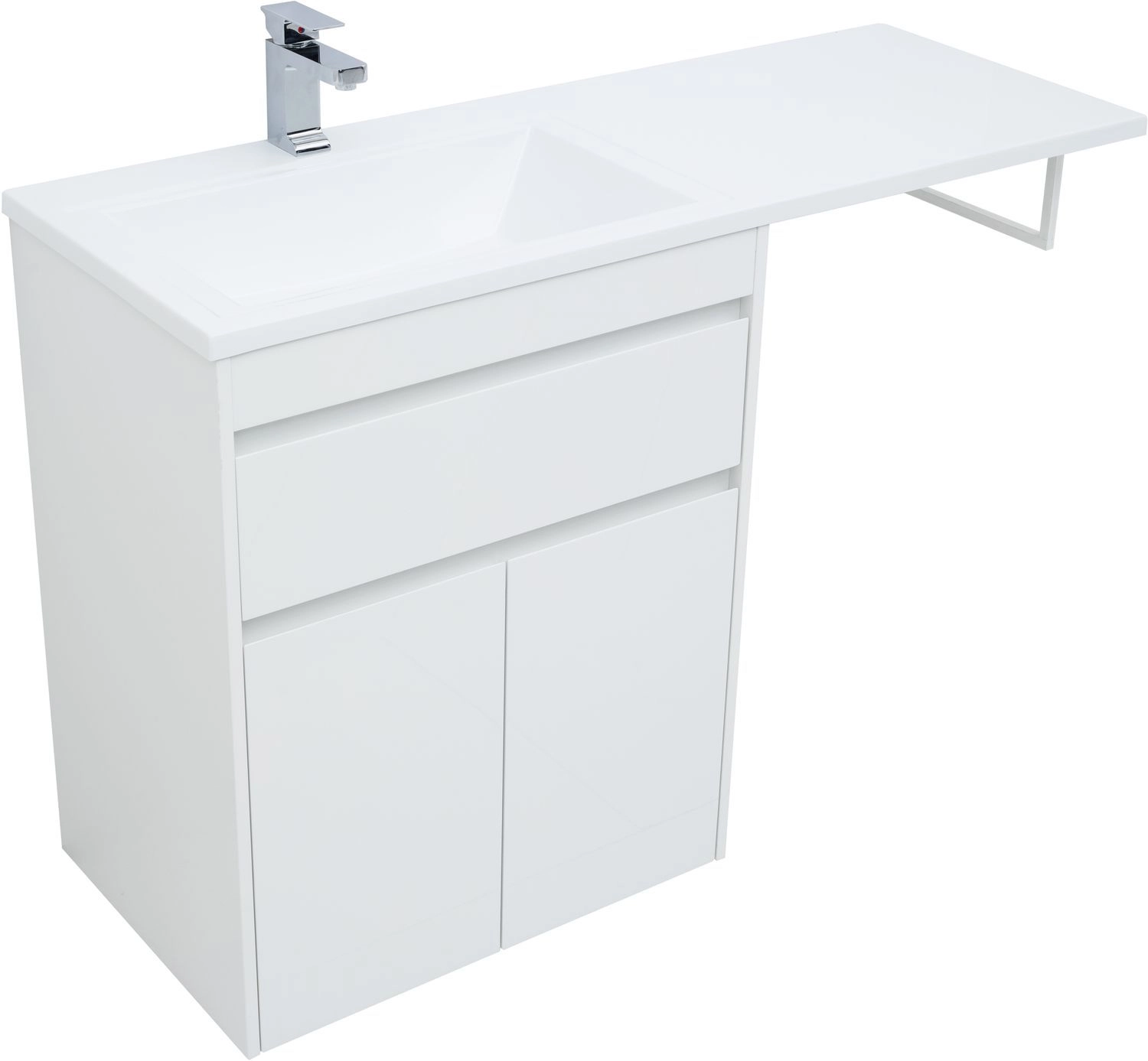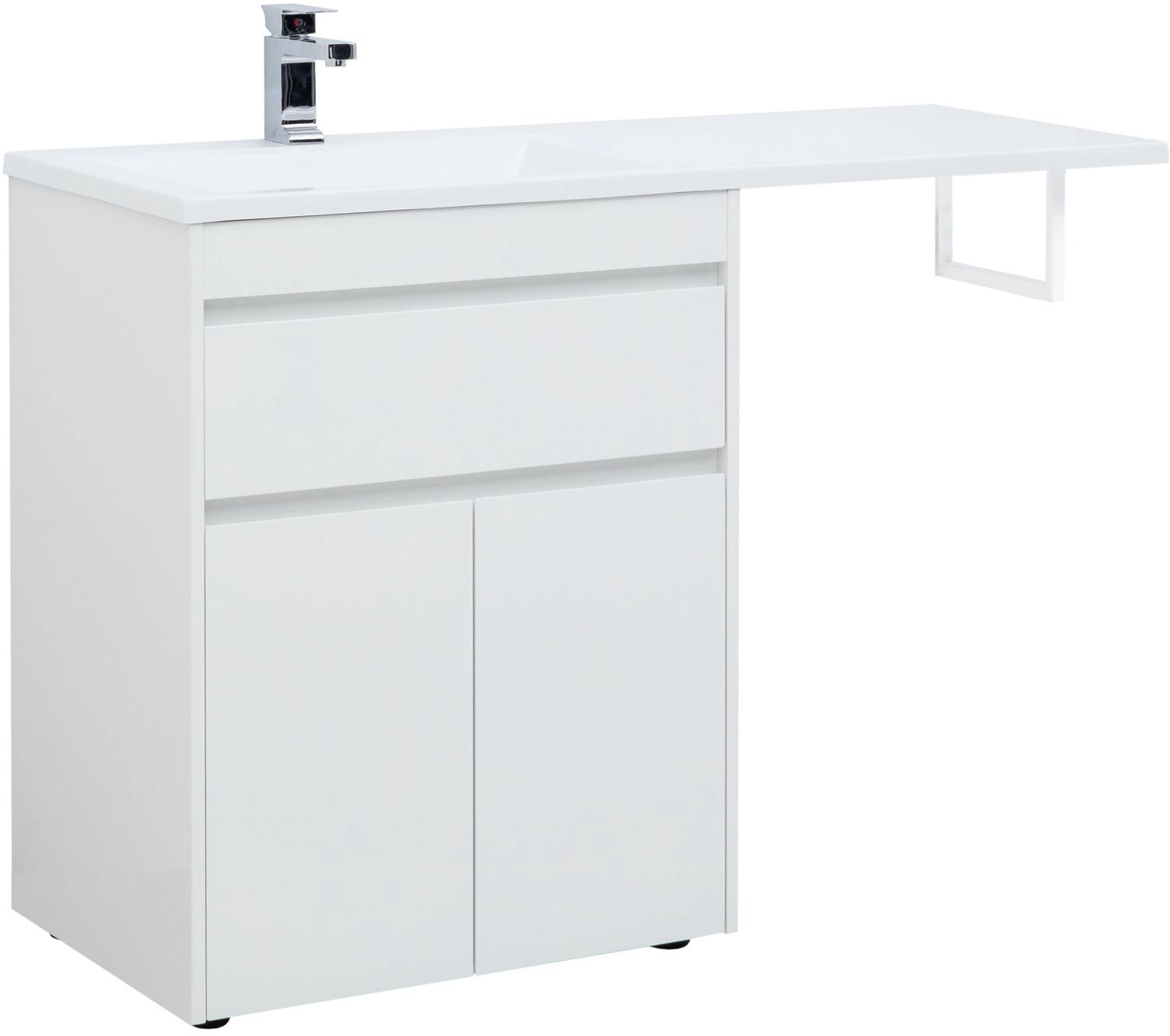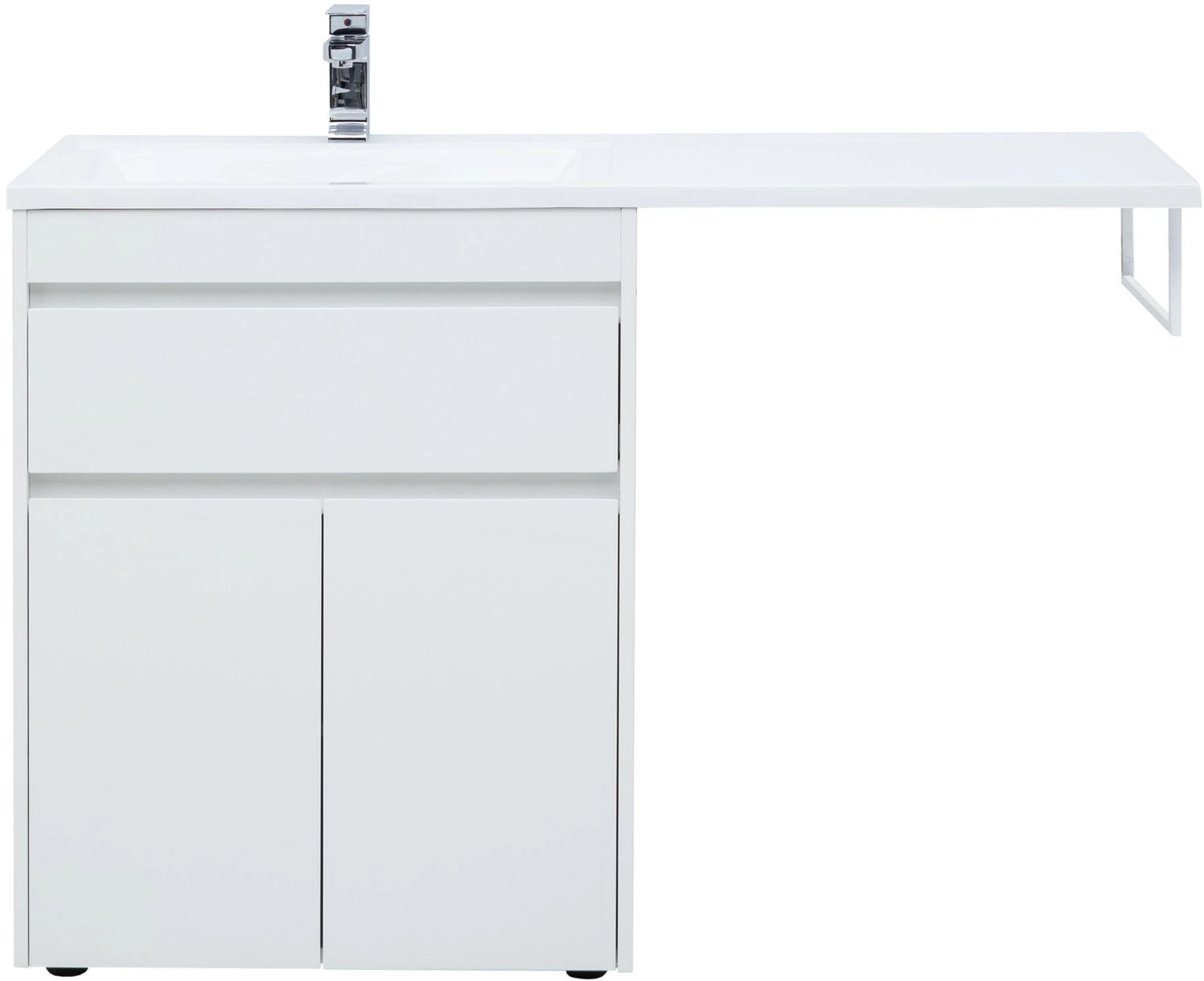 Тумба под раковину Aquanet Токио 130 (напольная, 1 ящик, 2 дверцы) белого цвета представляет новый формат тумб производства Aquanet. Раковина из литьевого мрамора имеет длинную платформу, которая выходит далеко за пределы тумбы. Она предназначена для того, чтобы установить с правой стороны от тумбы стиральную машину. Платформа имеет такую длину, которая позволит спрятать под нее машинку средних размеров с фронтальной загрузкой. Корпус тумбы выполнен из влагостойкого ЛДСП, а фасады – из МДФ с покрытием эмалью. Разнообразные зоны хранения в тумбе шириной 680 мм скрыты в ящике и за распашными дверками. Тумбу можно использовать и без соседства со стиральной машиной, а свободное пространство под платформой раковины занять подкатной тумбой, приспособлениями для уборки помещения или столиком.